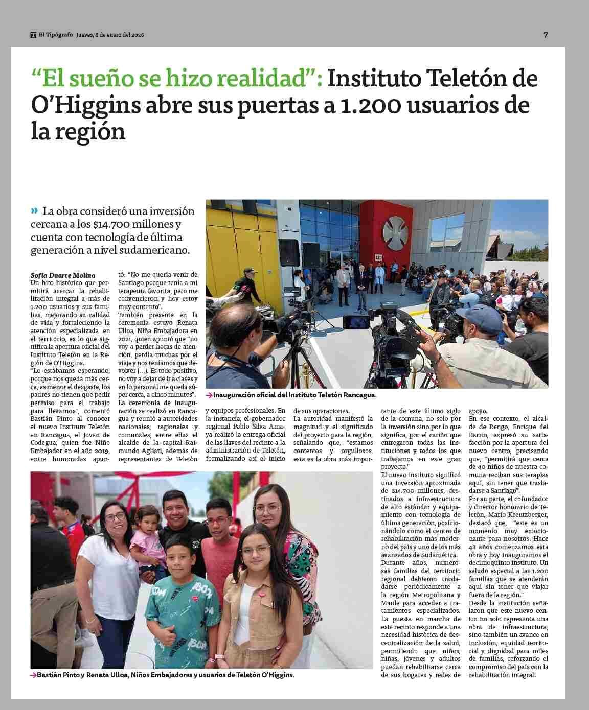 "El sueño se hizo realidad": Instituto Teletón de O'Higgins abre sus puertas a 1.200 usuarios de 08-01-2026 El Tipógrafo |
