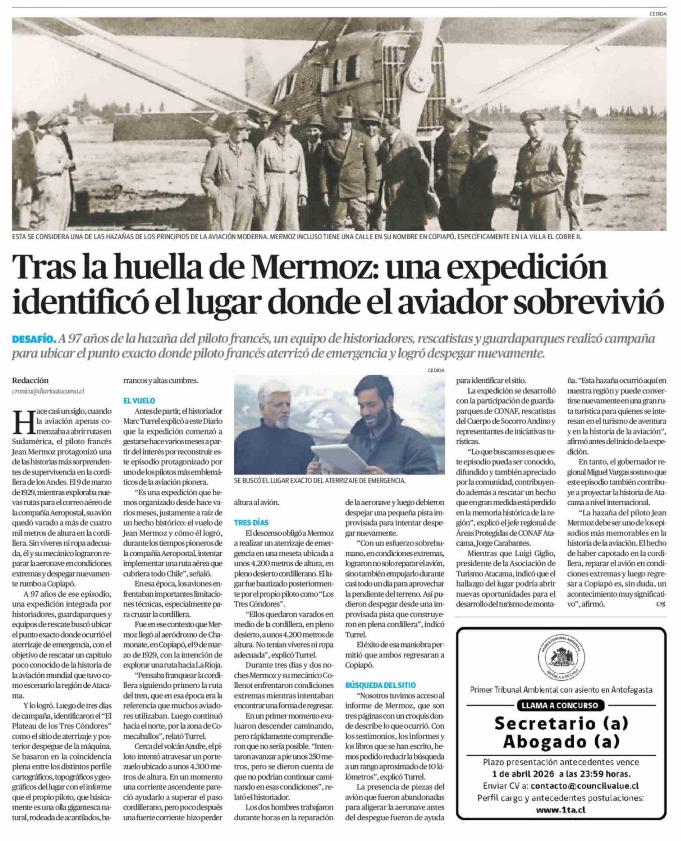 Tras la huella de Mermoz: una expedición identificó el lugar donde el aviador sobrevivió 16-03-2026 El Diario de Atacama |