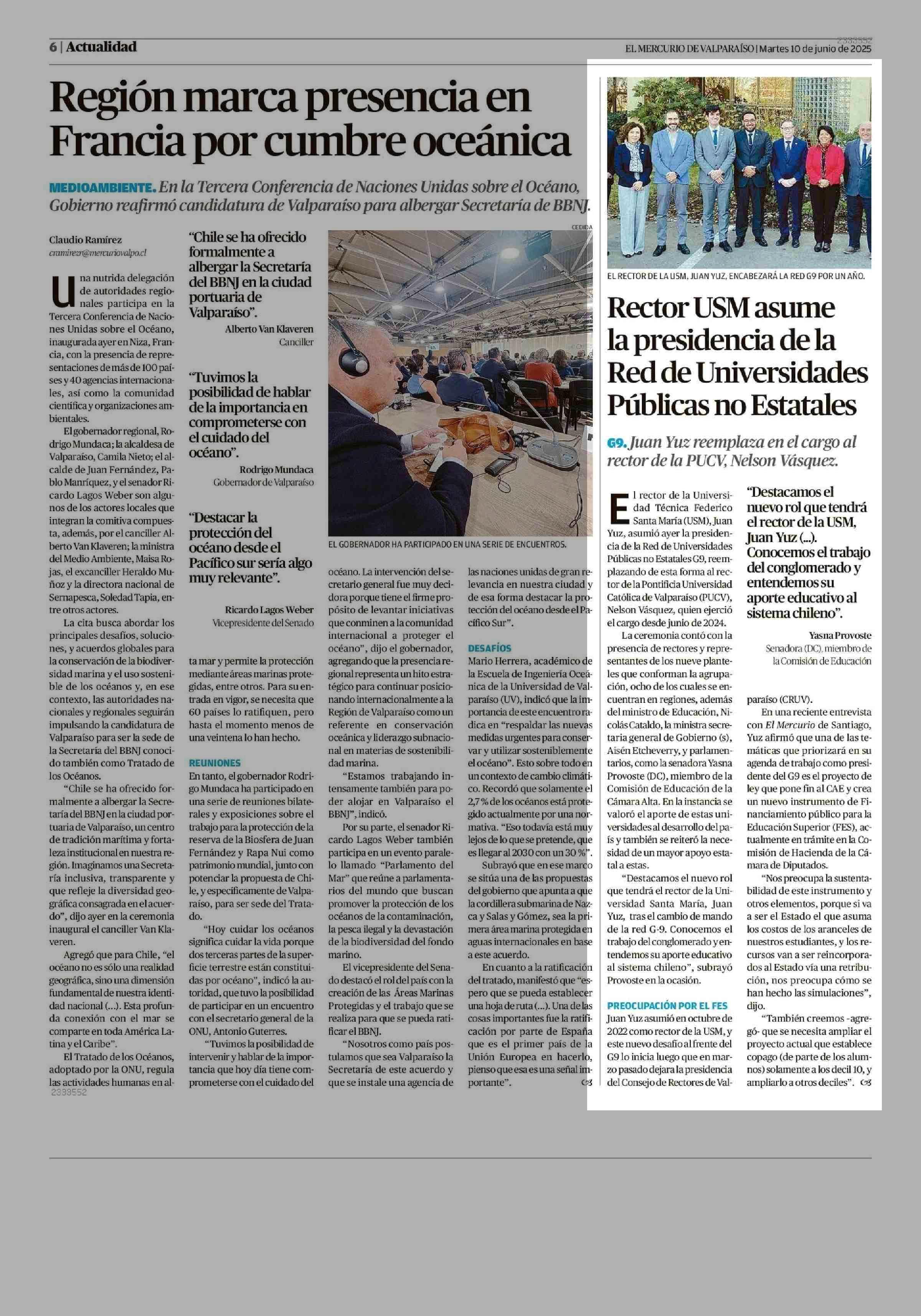 Rector USM asume la presidencia de la Públicas no Estatales Red de Universidades 10-06-2025 El Mercurio de Valparaíso |