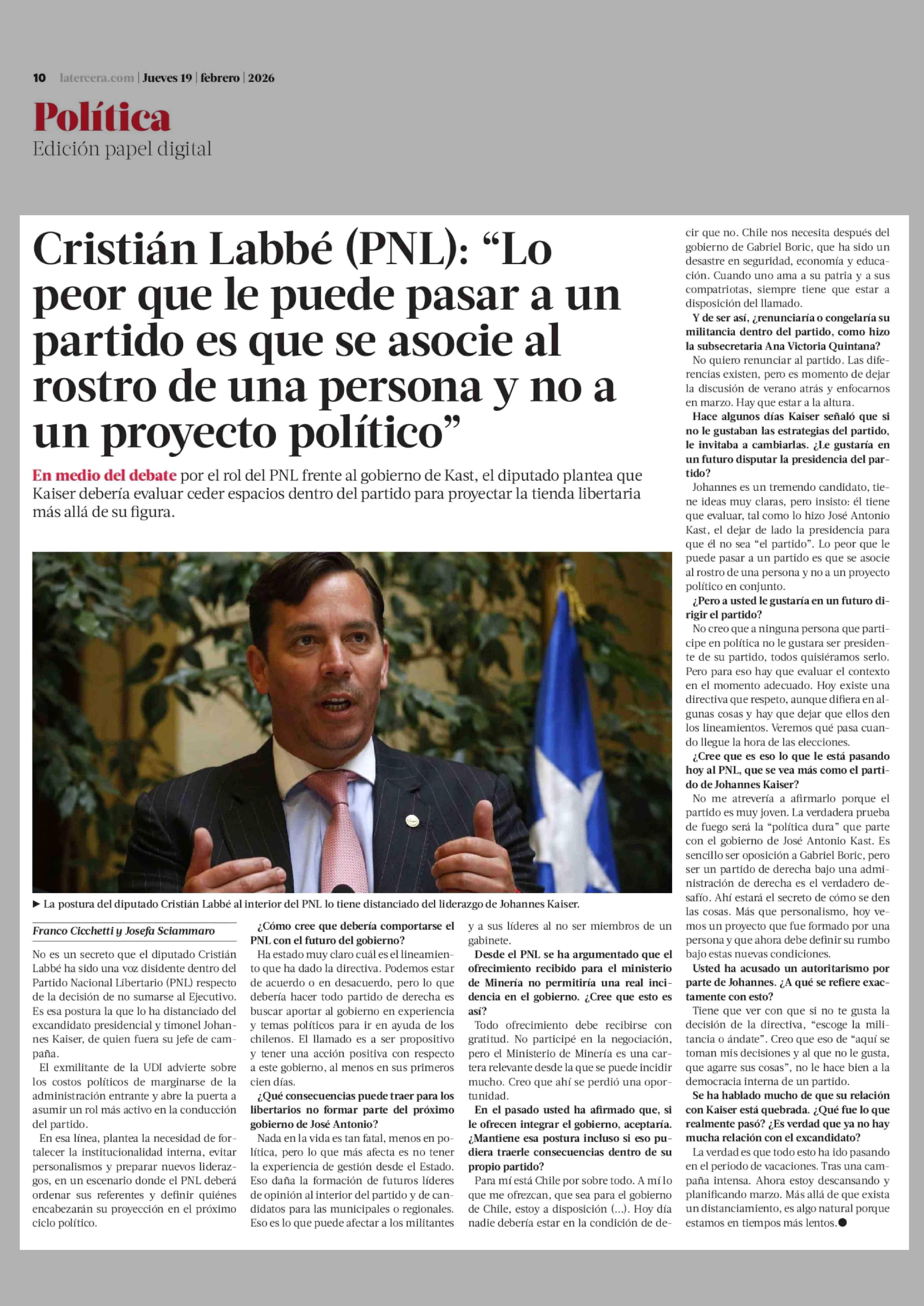 Título: Cristián Labbé (PNL): "Lo peor que le puede pasar a un partido es que se asocie al rostro de una persona y no a un proyecto político"