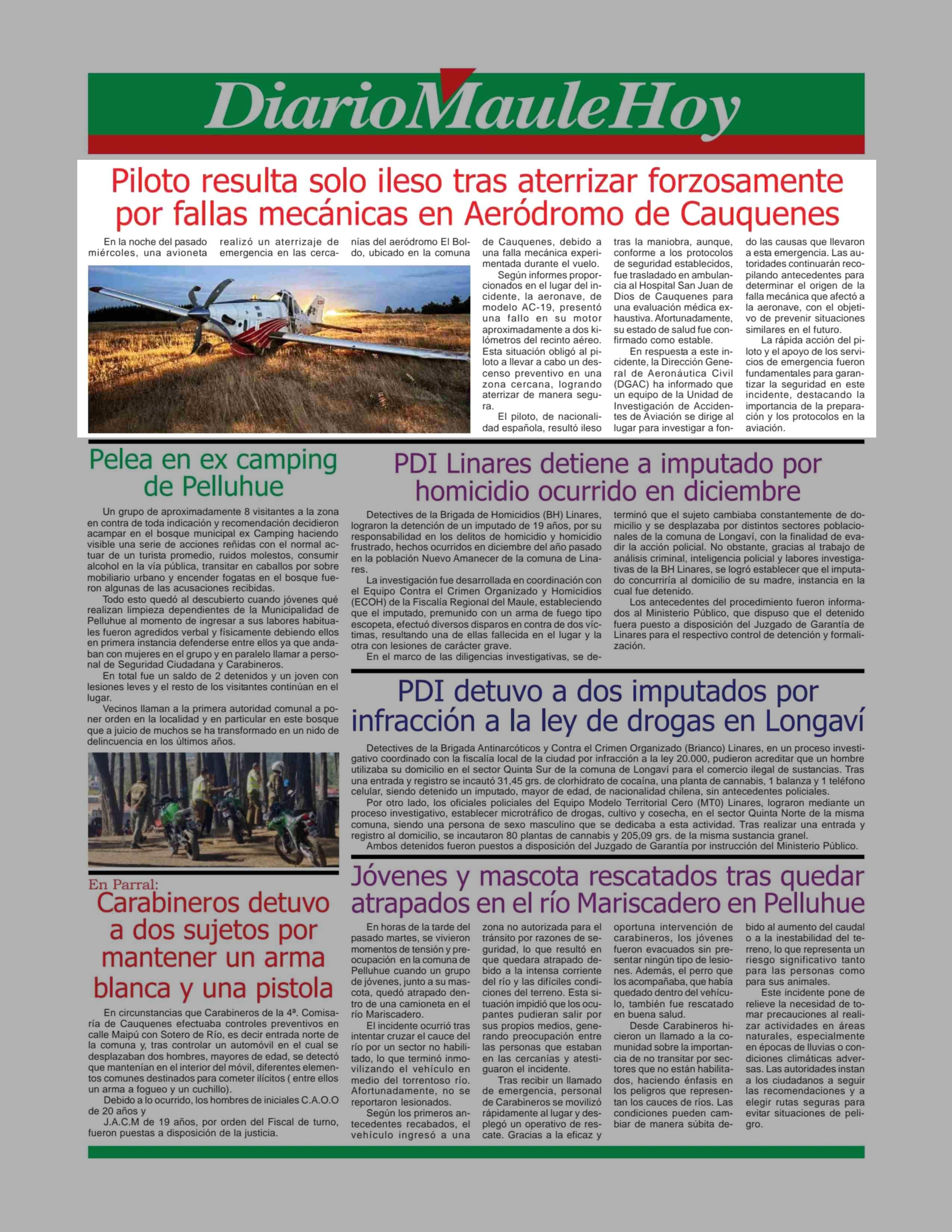 | Título: | Piloto resulta solo ileso tras aterrizar forzosamente por fallas mecánicas en Aeródromo de Cauquenes |