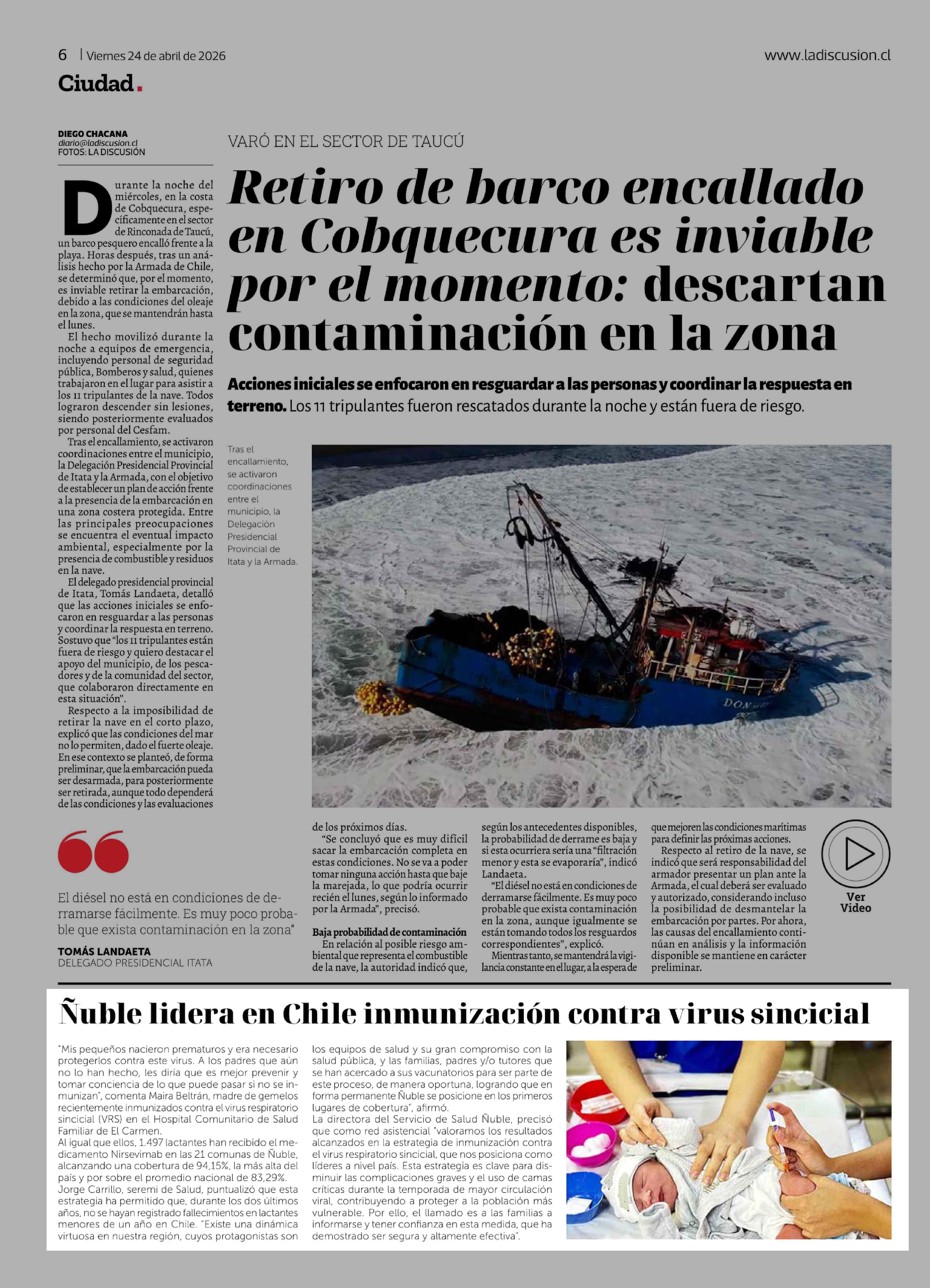 Ñuble lidera en Chile inmunización contra virus sincicial 24-04-2026 La Discusión |