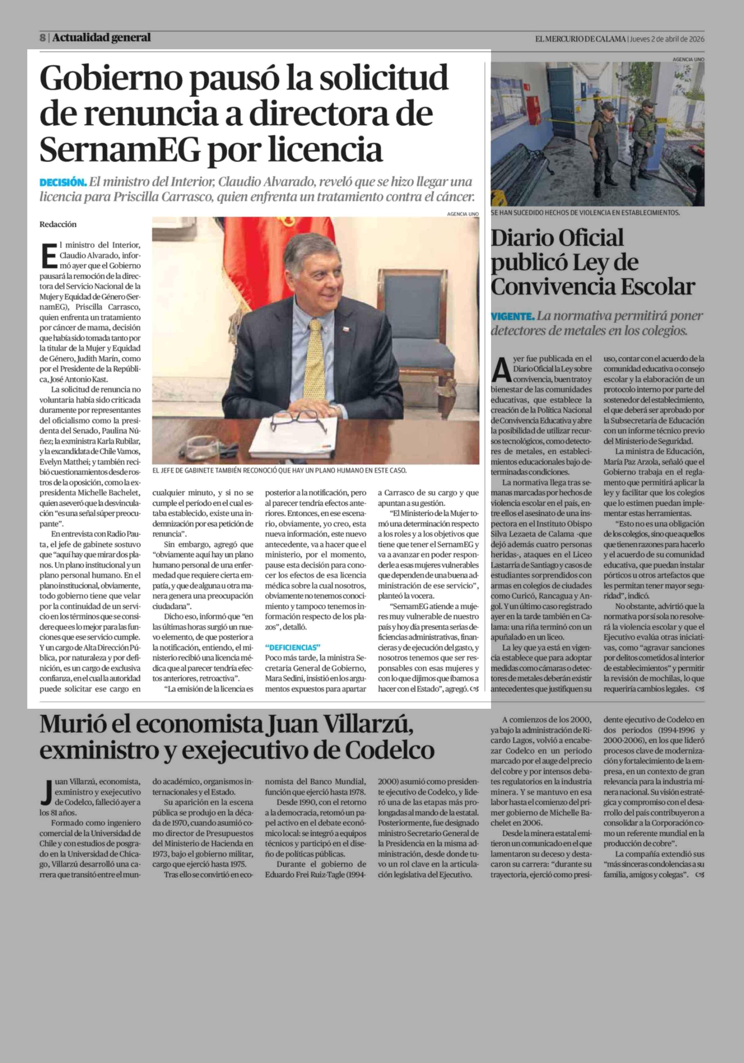 Gobierno pausó la solicitud de renuncia a directora de SernamEG por licencia 02-04-2026 El Mercurio de Calama |