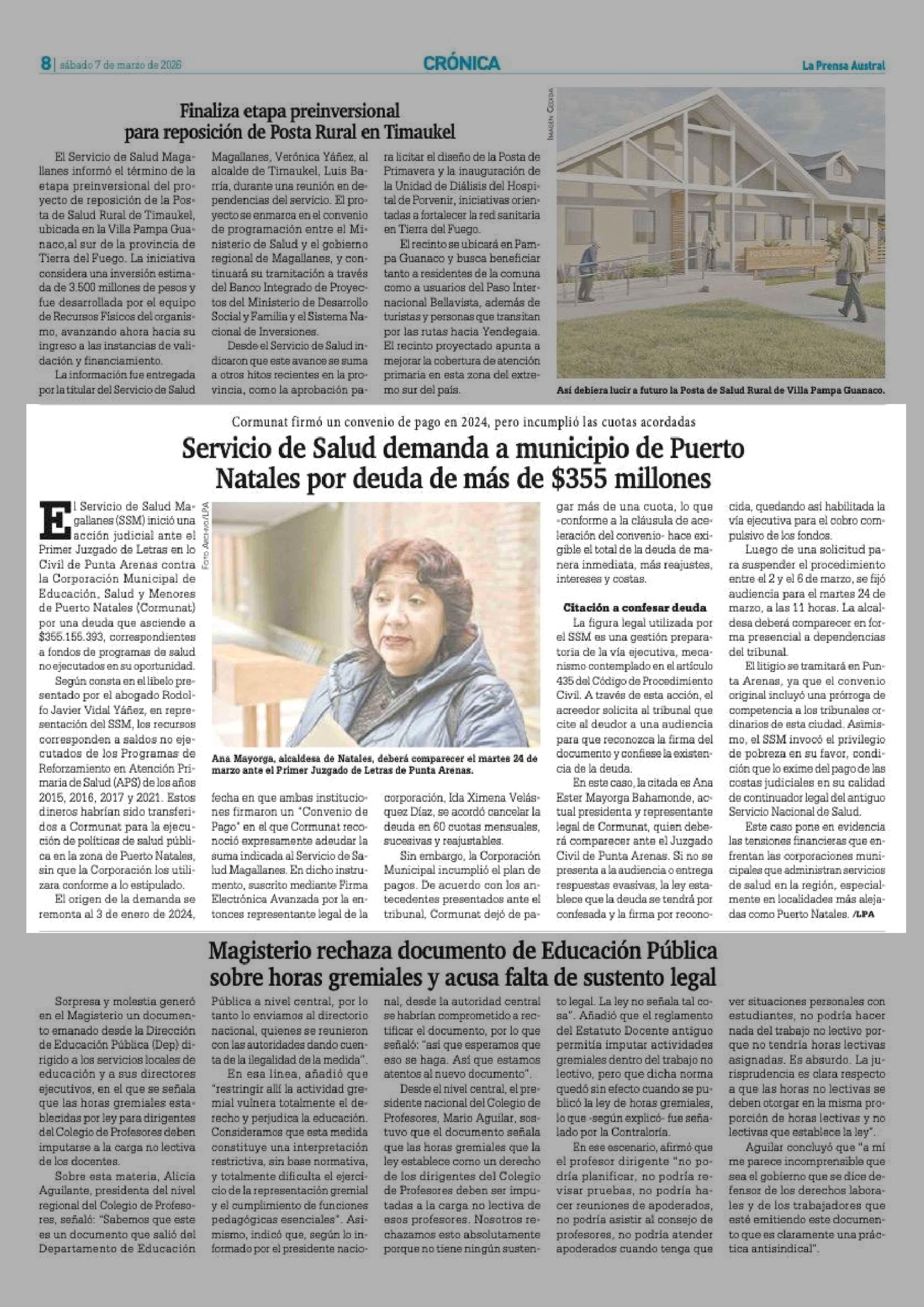 Servicio de Salud demanda a municipio de Puerto Natales por deuda de más de $355 millones 07-03-2026 La Prensa Austral |