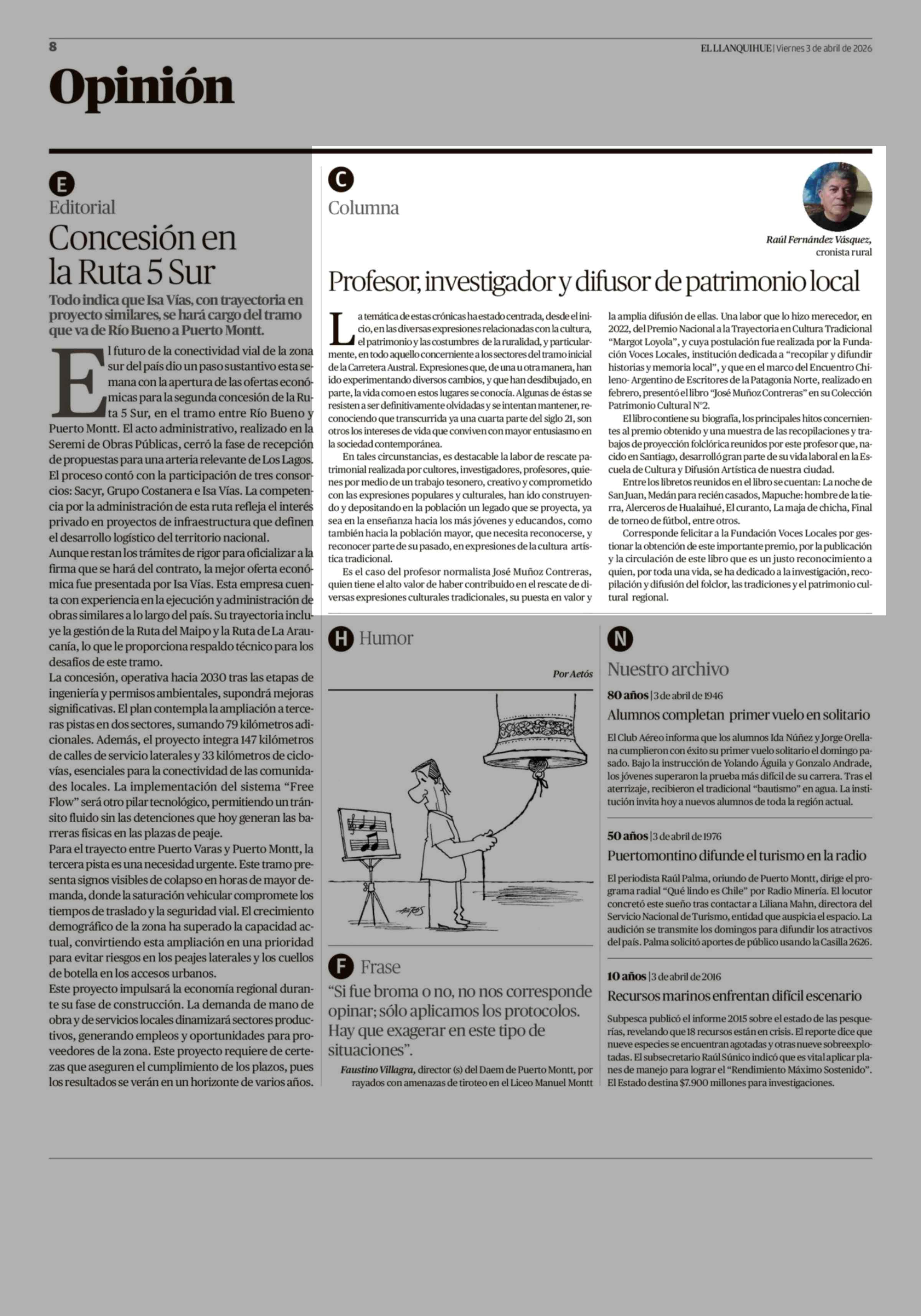 Columnas de Opinión: Profesor, investigador y difusor de patrimonio local 03-04-2026 El Llanquihue |