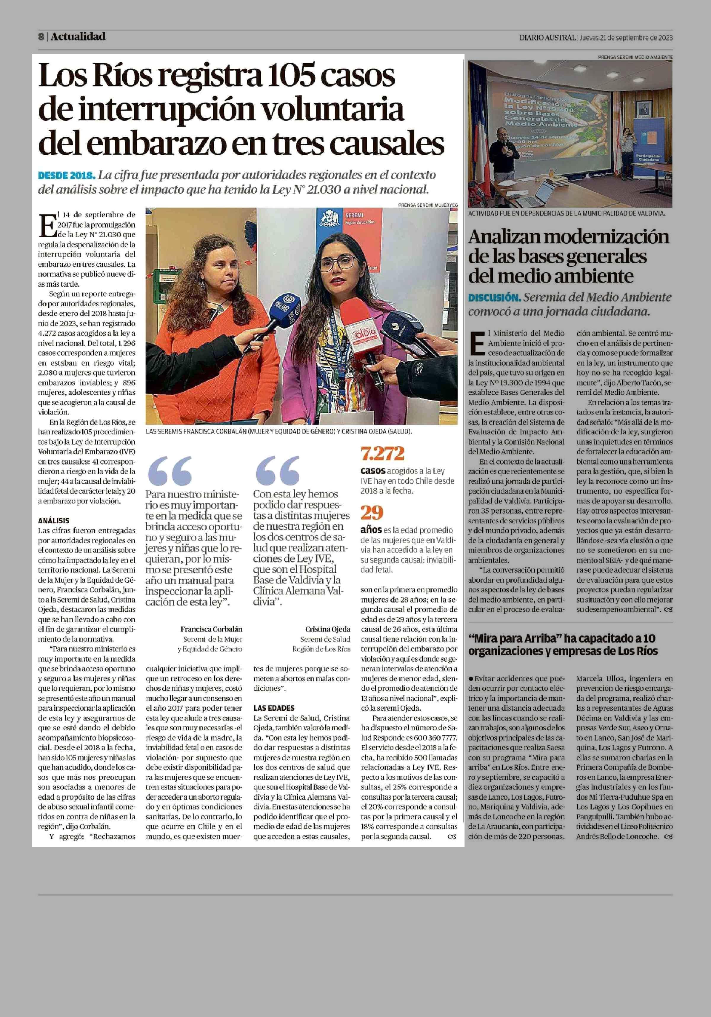 Los Ríos registra 105 casos de interrupción voluntaria del embarazo en tres causales 21-09-2023 Diario Austral Región de Los Ríos |