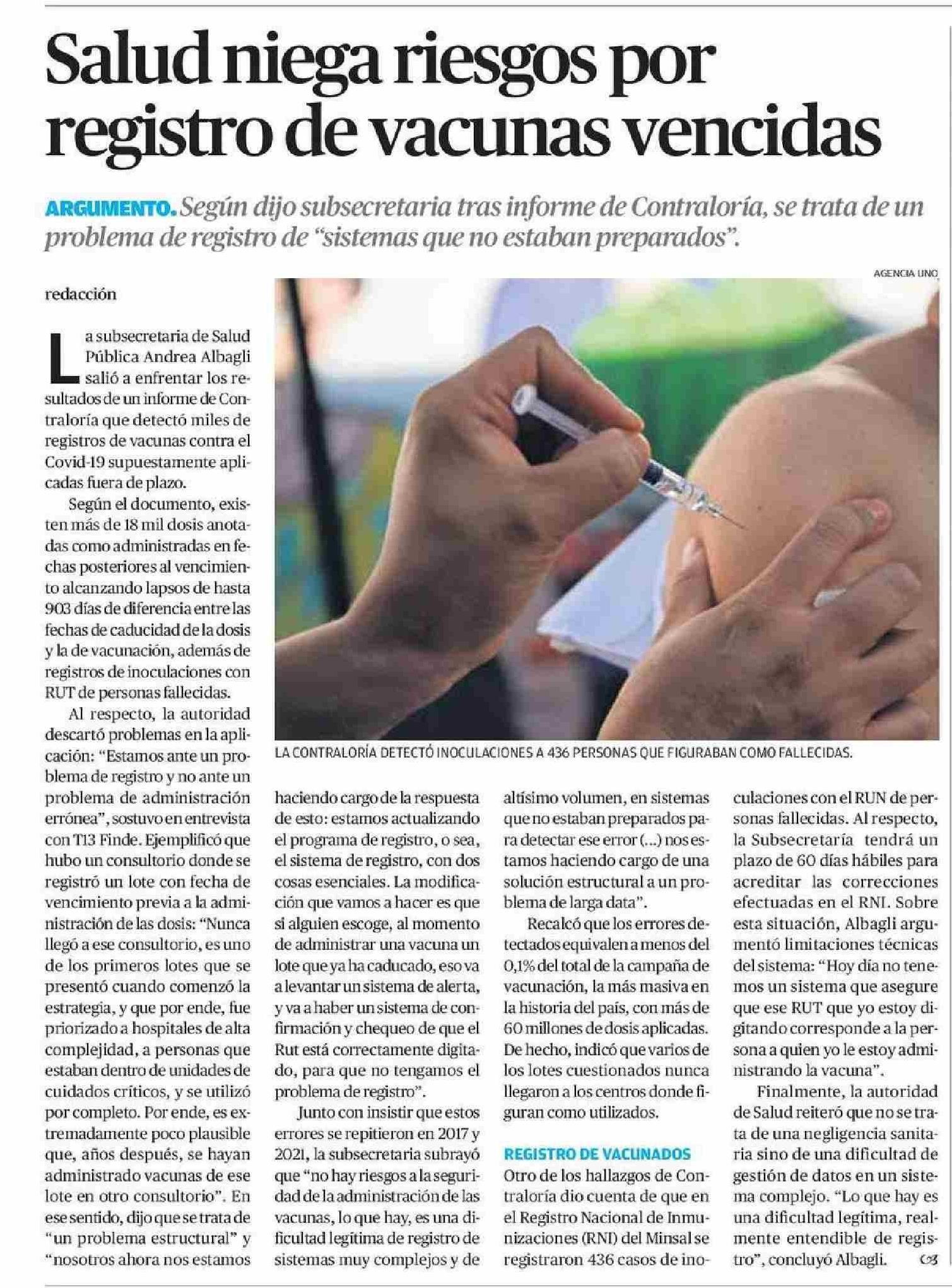 Salud niega riesgos por registro de vacunas vencidas 11-05-2025 El Mercurio de Calama |