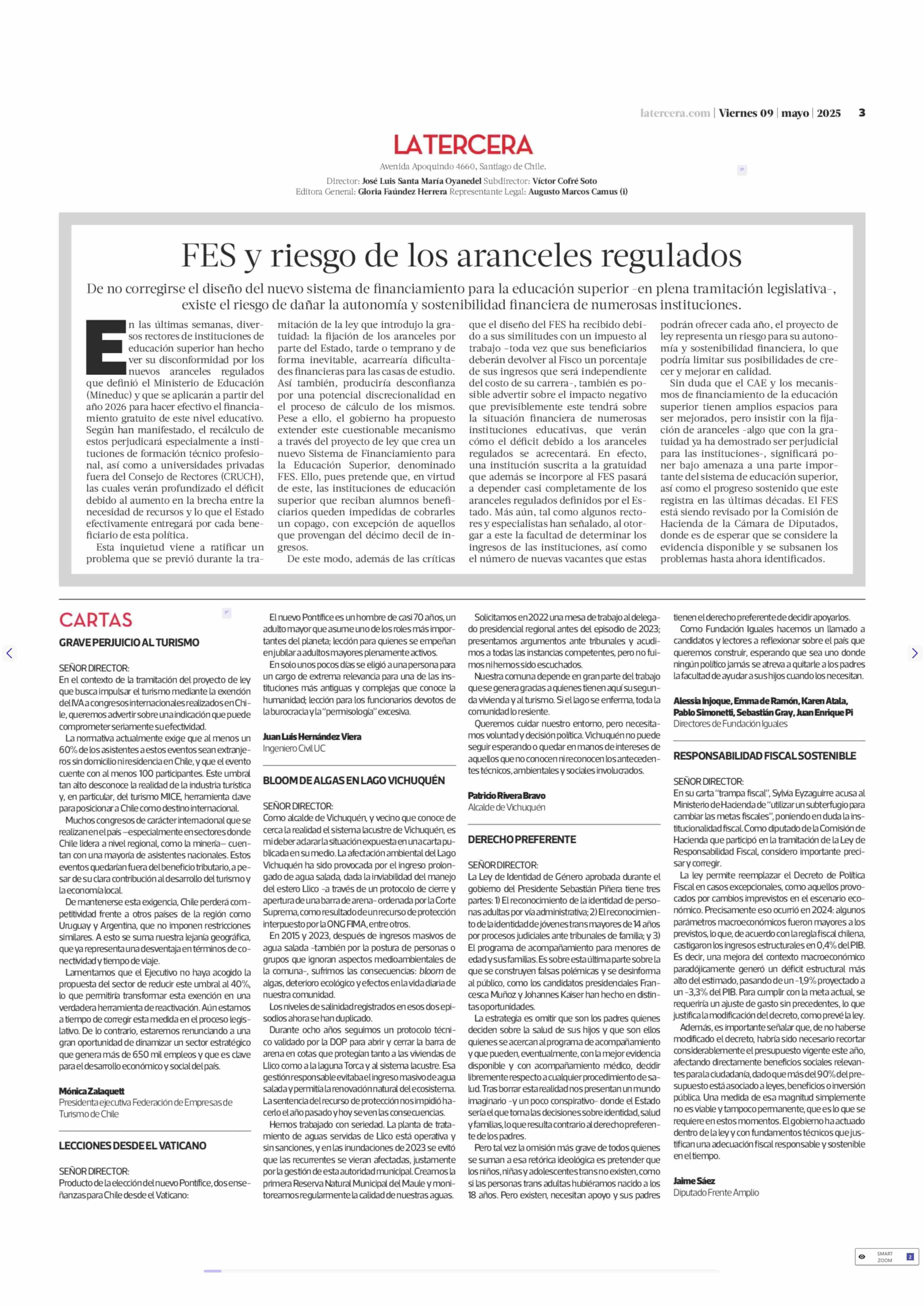 Editorial: FES y riesgo de los aranceles regulados 09-05-2025 La Tercera |