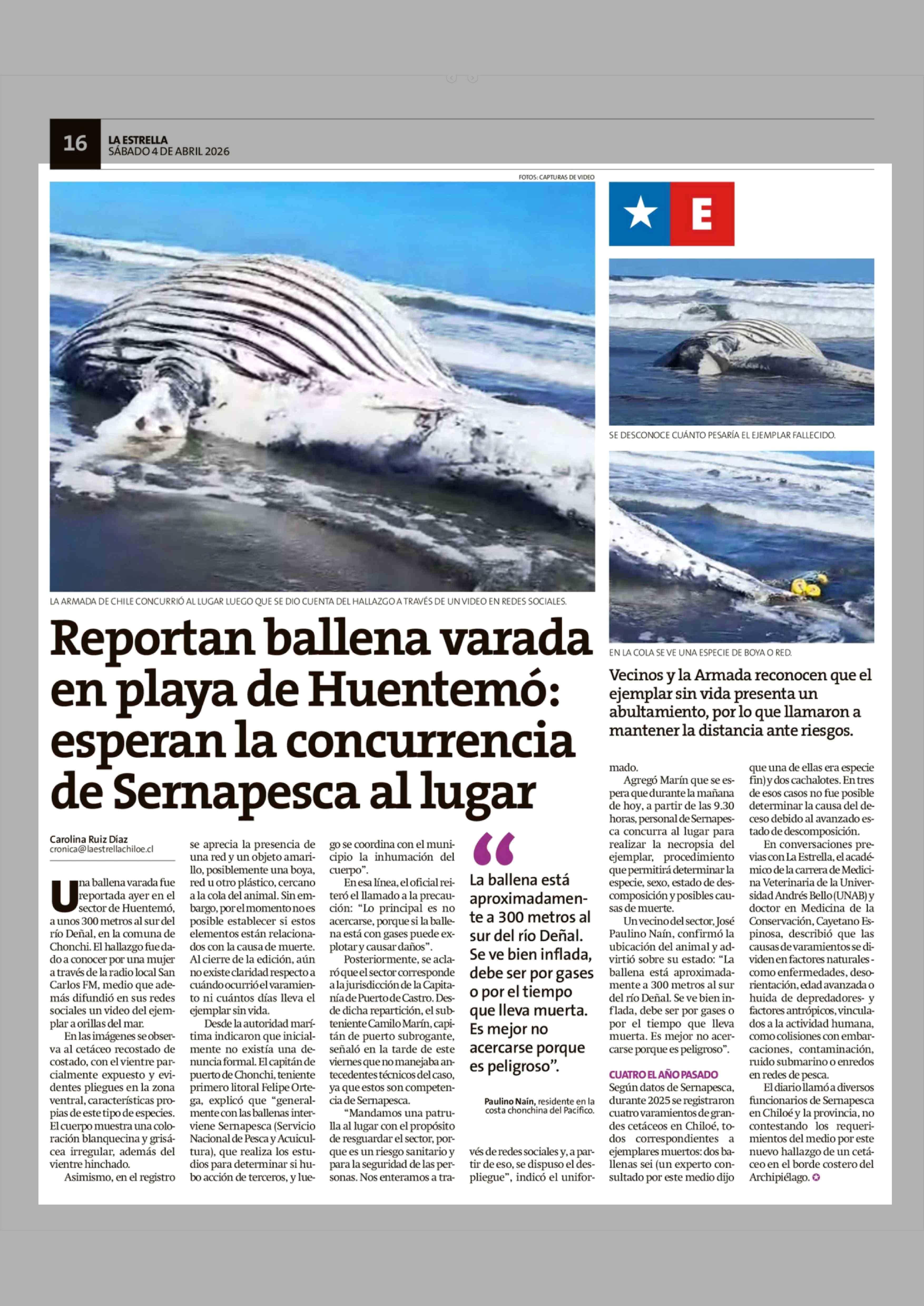 Reportan ballena varada en playa de Huentemó: esperan la concurrencia de Sernapesca al lugar 04-04-2026 La Estrella de Chiloé |