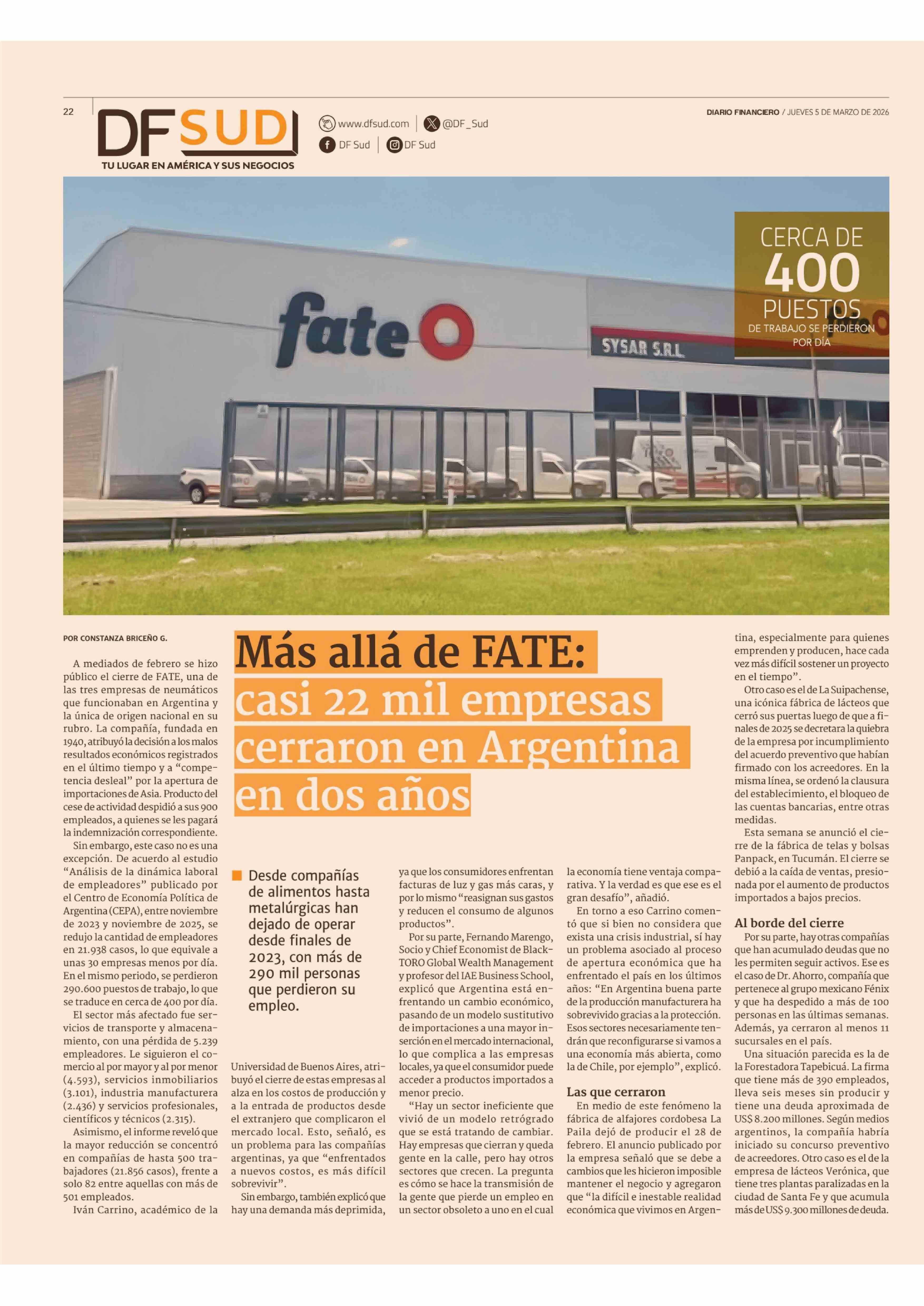 Fuente: Diario Financiero (Diario Financiero) Página(s): 22