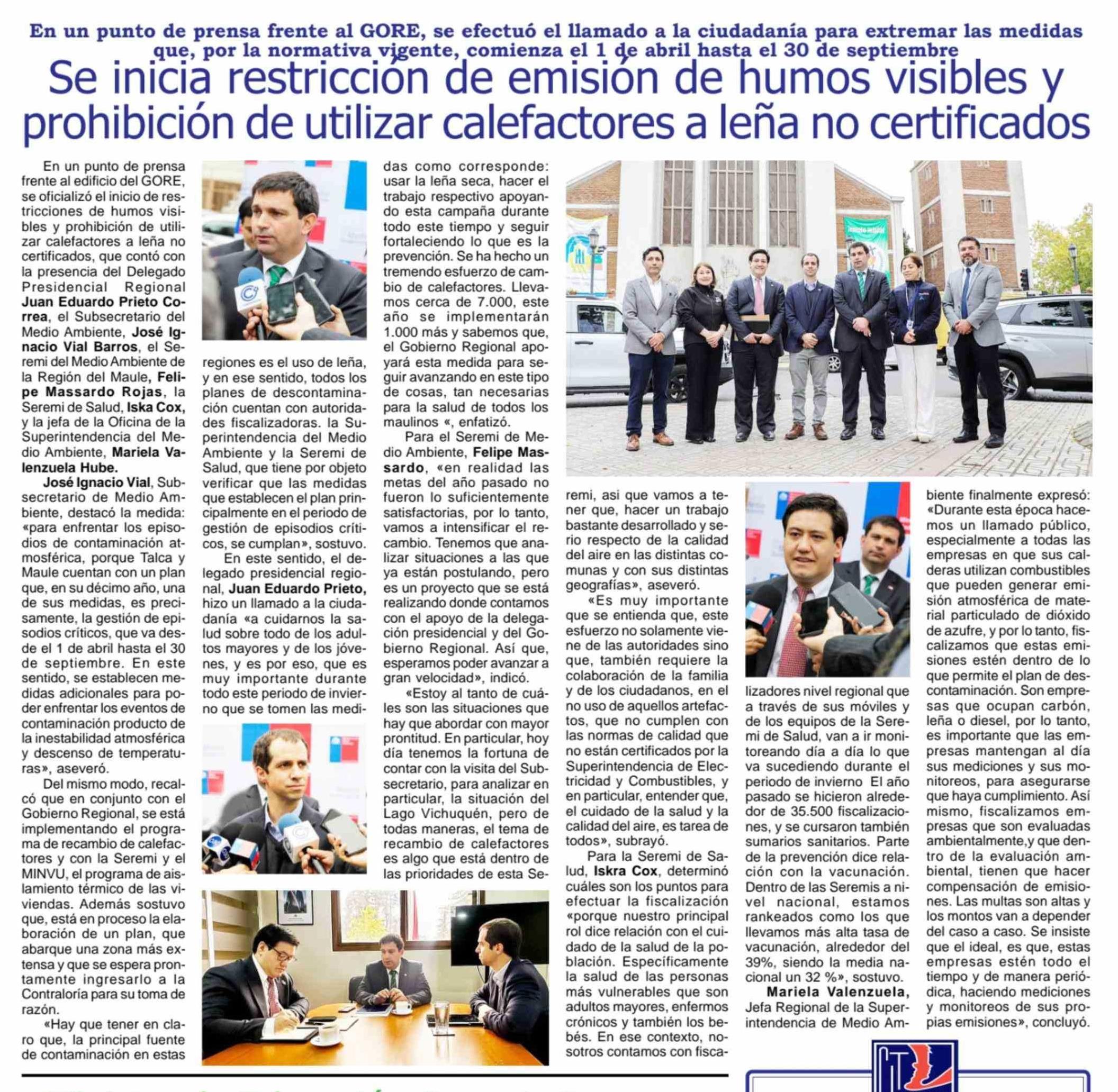 Título: Se inicia restricción de emisión de humos visibles y prohibición de utilizar calefactores a leña no certificados