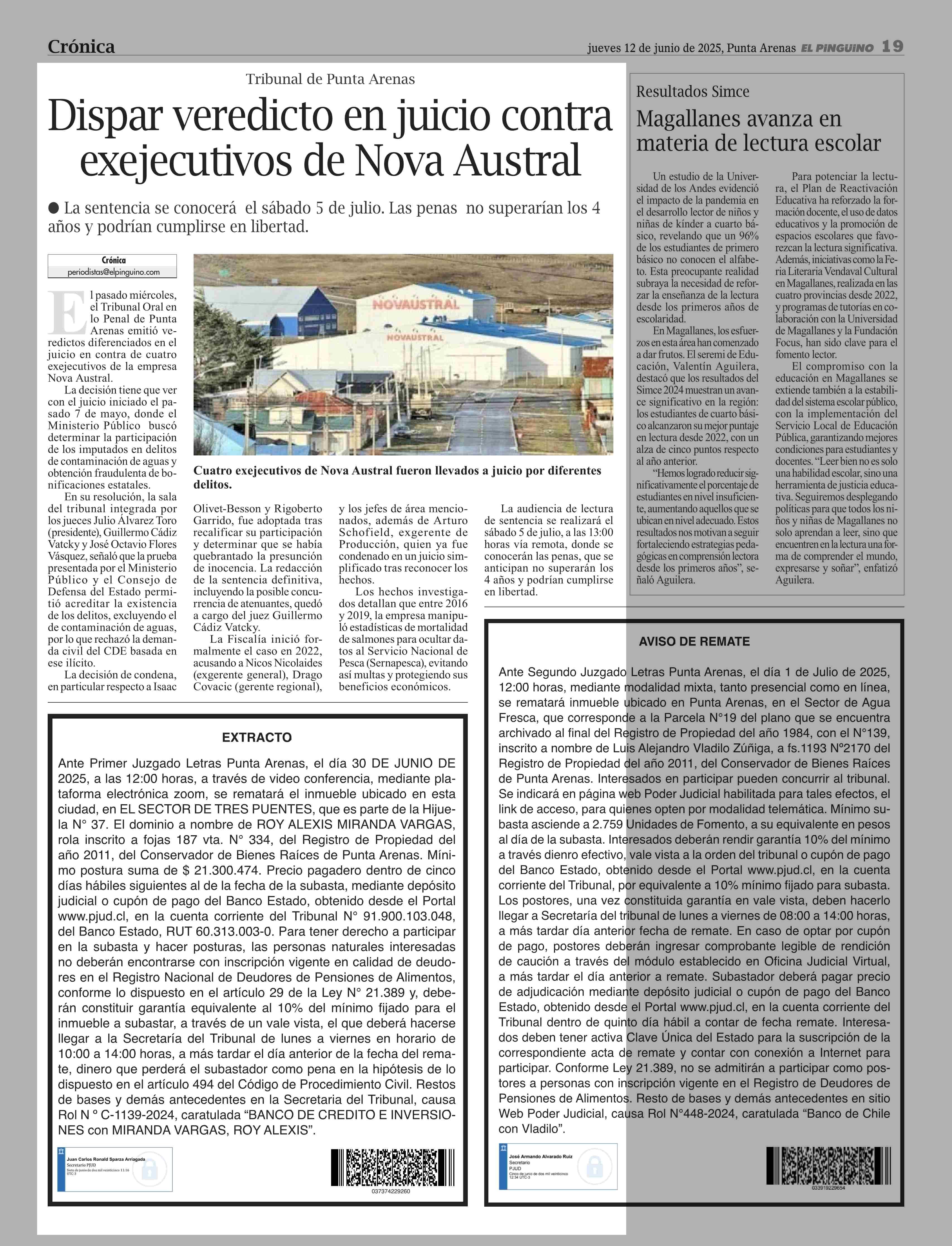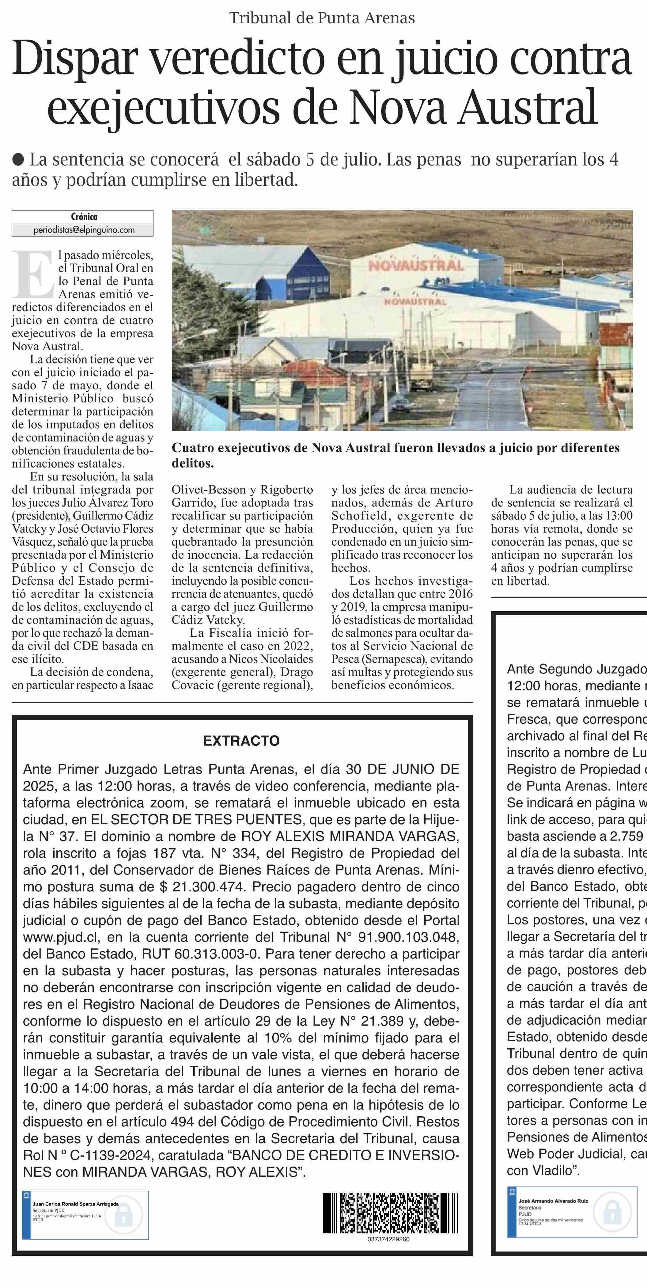 Dispar veredicto en juicio contra exejecutivos de Nova Austral 12-06-2025 El Pingüino |