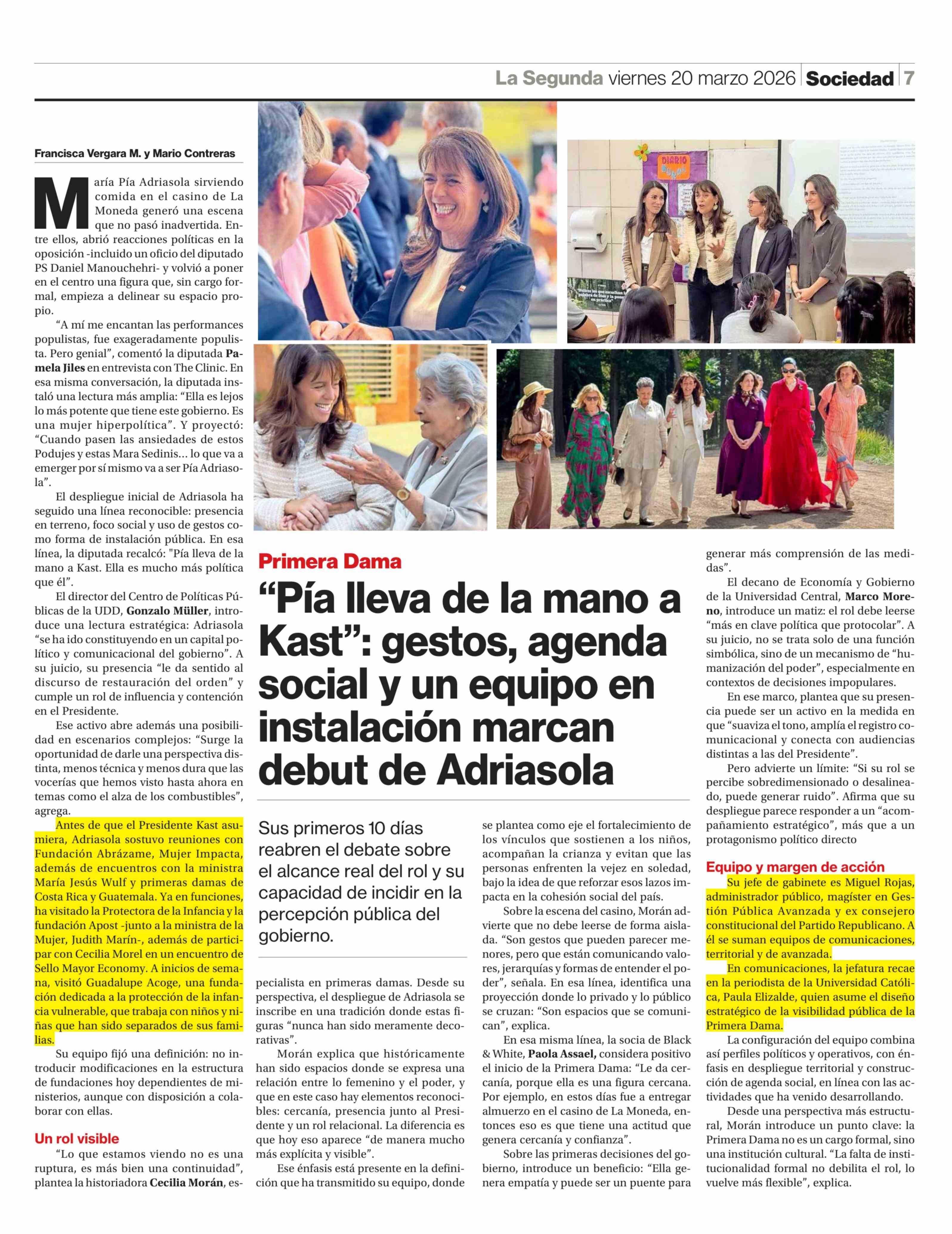 "Pía lleva de la mano a Kast": gestos, agenda social y un equipo en instalación marcan debut de Adriasola 20-03-2026 La Segunda |