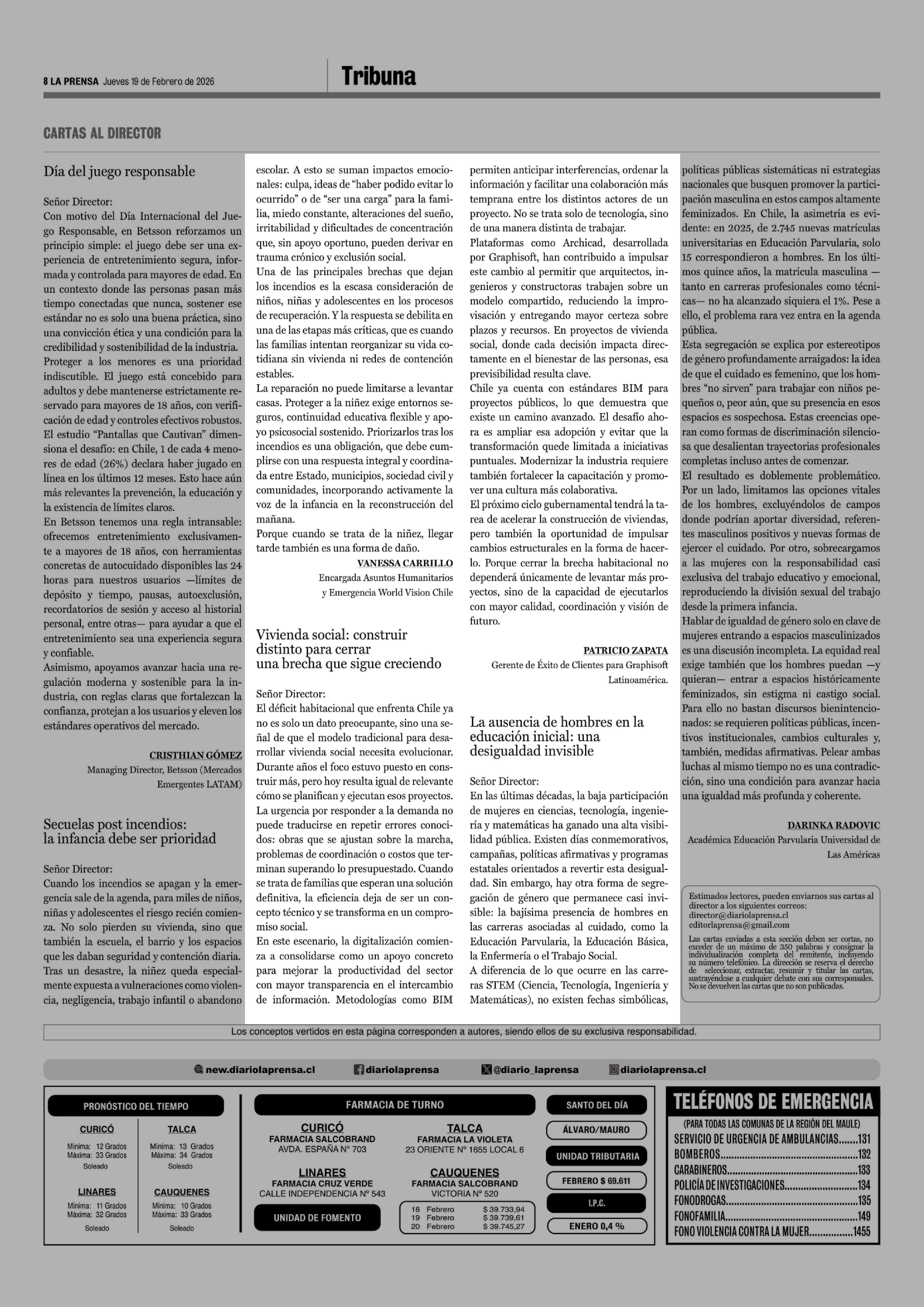 Cartas: Vivienda social: construir distinto para cerrar una brecha que sigue creciendo 19-02-2026 La Prensa de Curicó |