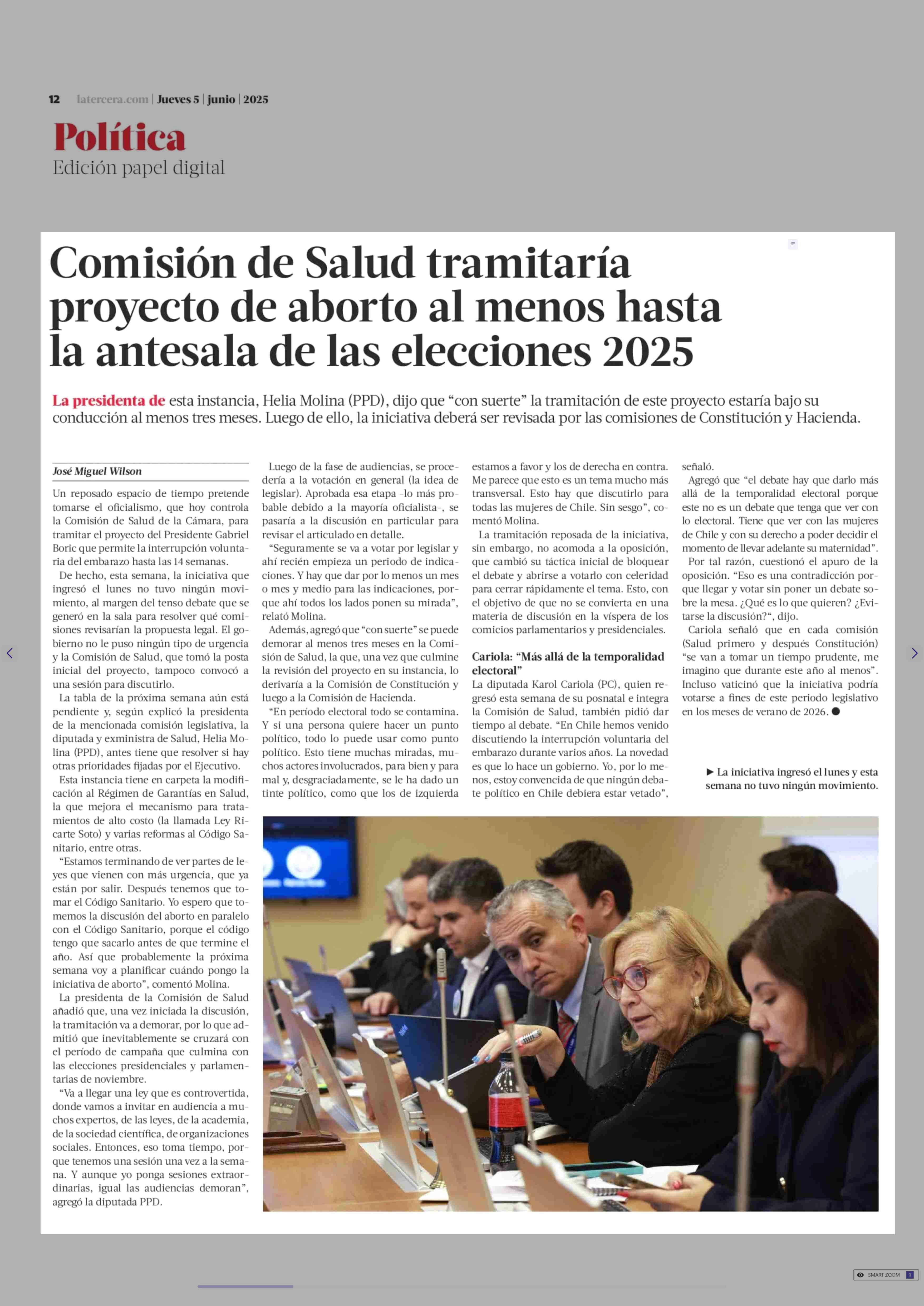 Comisión de Salud tramitaría proyecto de aborto al menos hasta la antesala de las elecciones 2025 05-06-2025 La Tercera |
