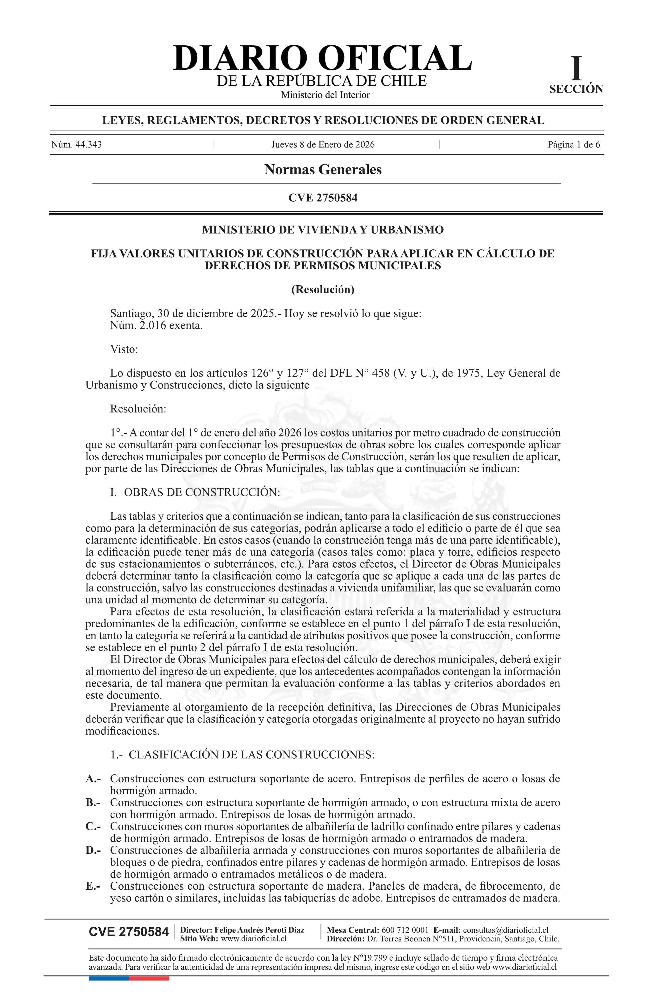 Resolución exenta número 2.016, de 2025.- Fija valores unitarios de construcción para aplicar en cálculo de derechos de permisos municipales 08-01-2026 DIARIO OFICIAL CHILE - BOLETÍN OFICIAL DE MINERÍA |
