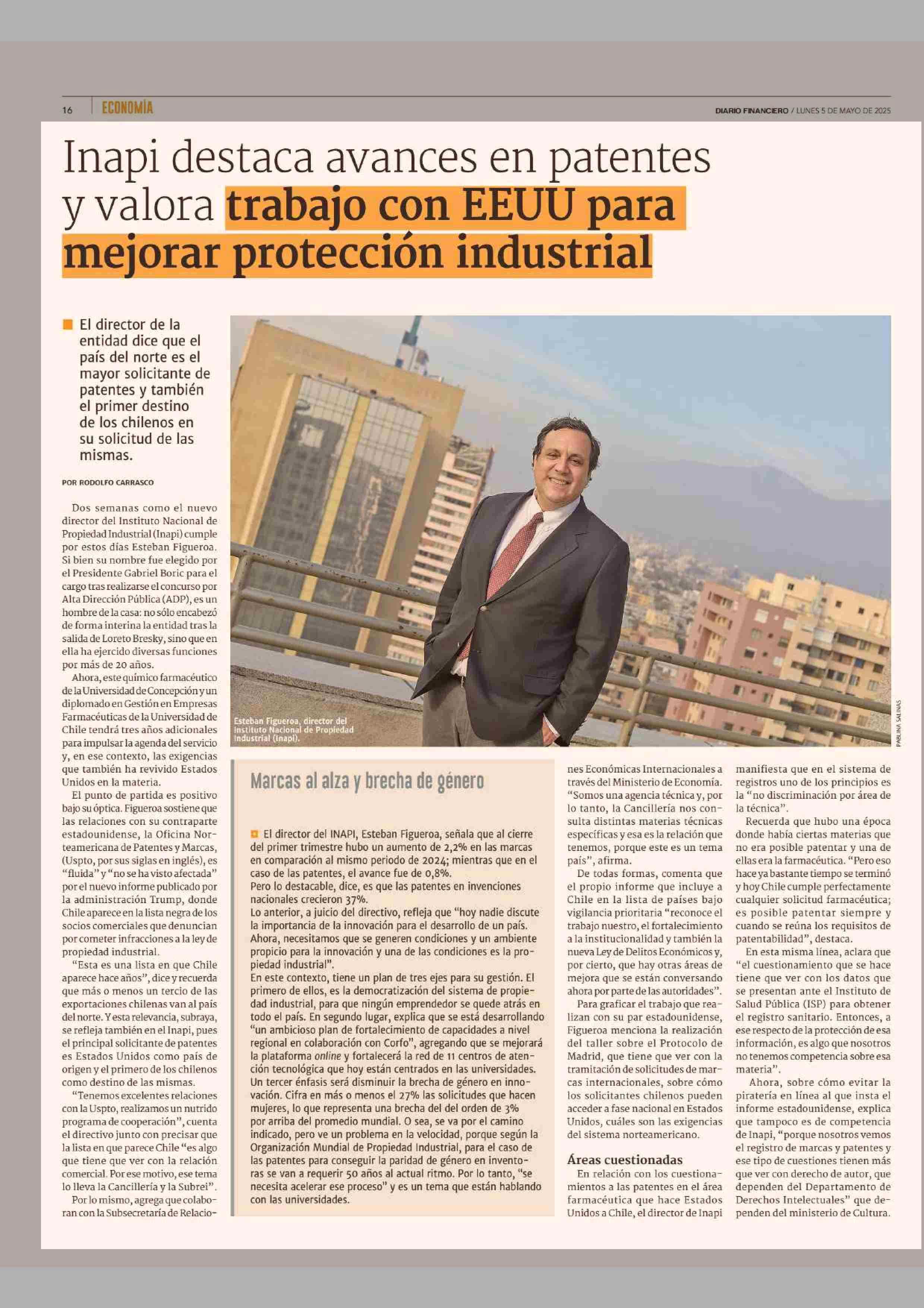 Inapi destaca avances en patentes y valora trabajo con EEUU para mejorar protección industrial 05-05-2025 Diario Financiero |