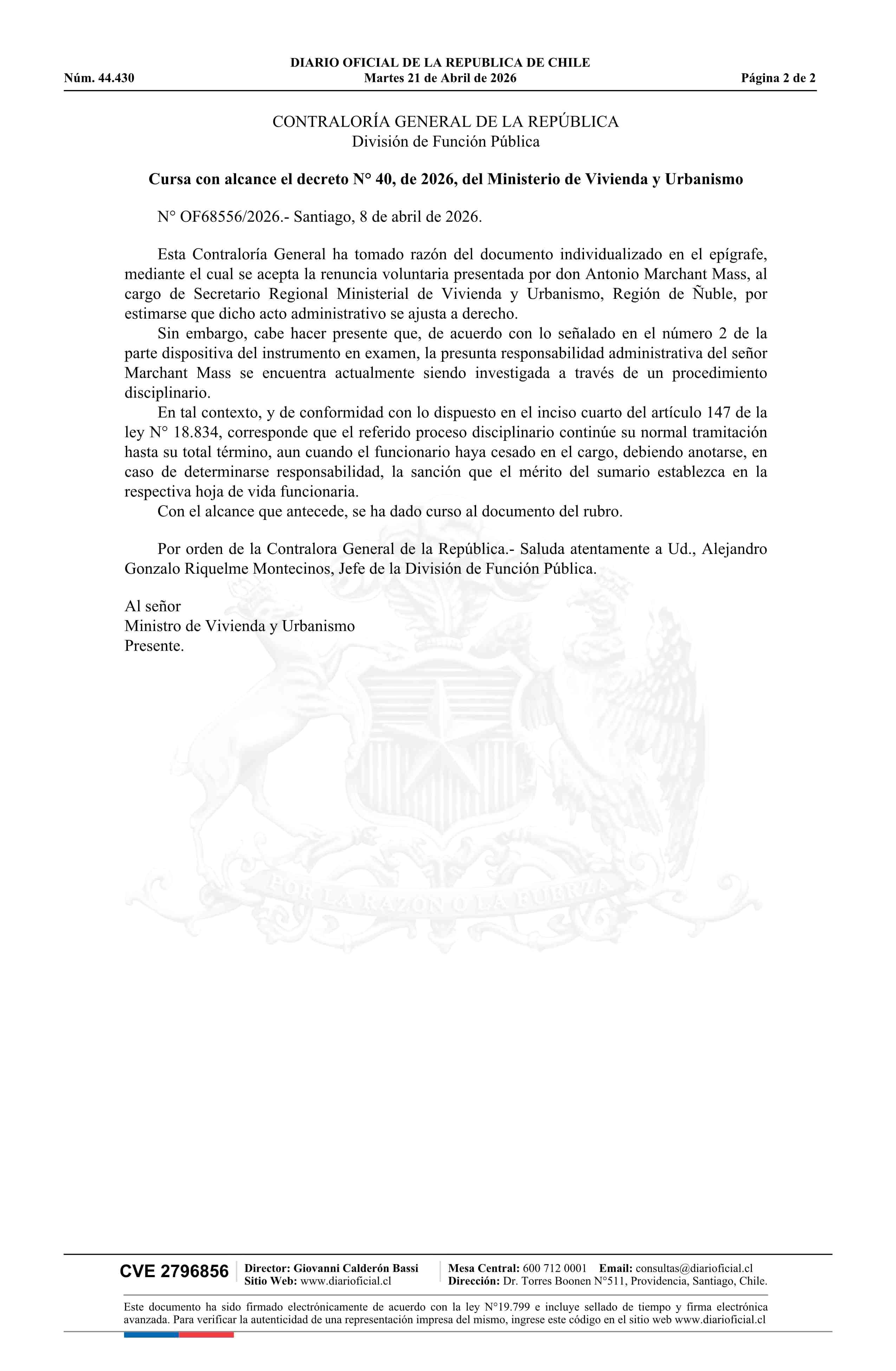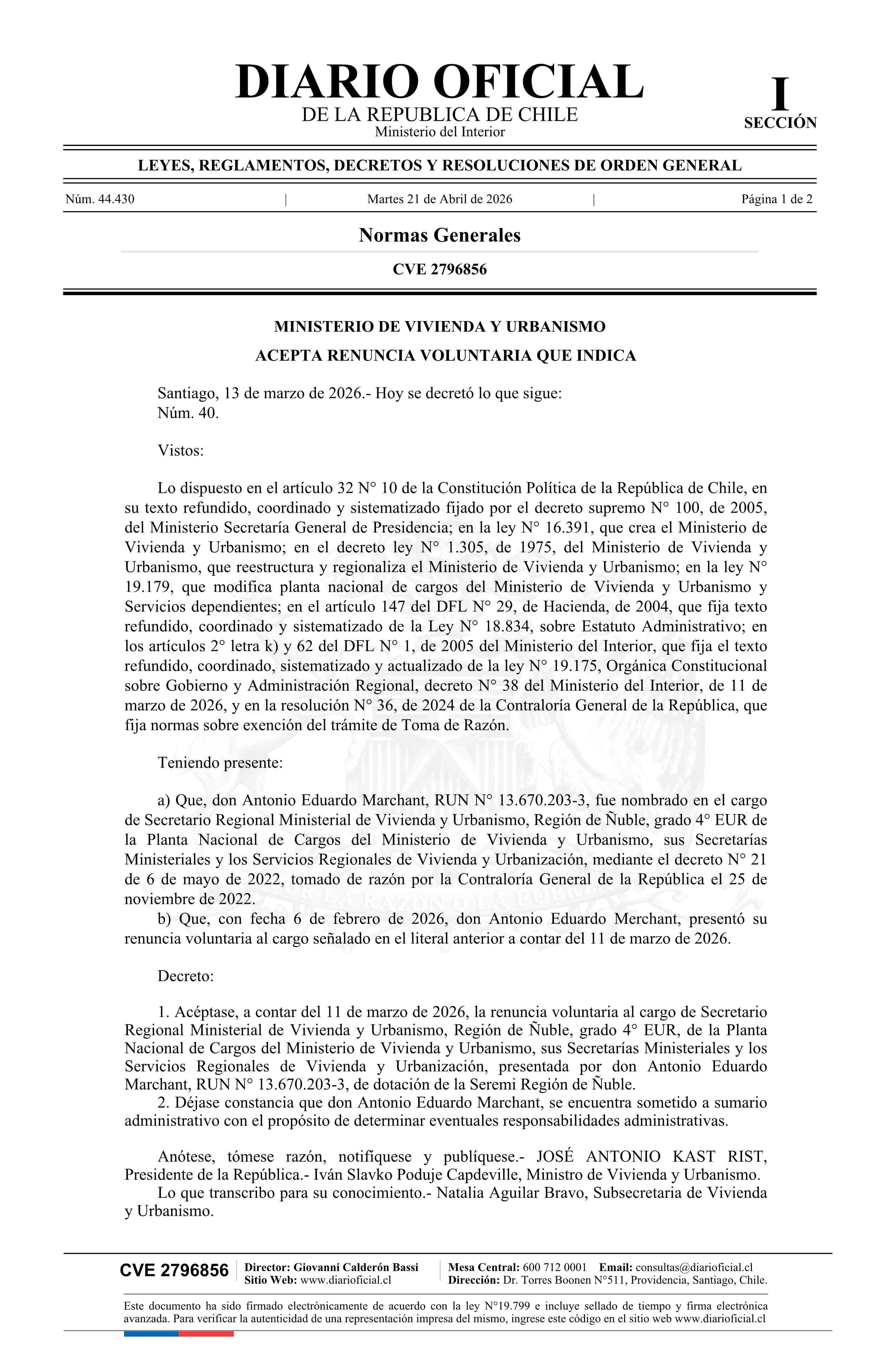 Decreto número 40, de 2026.- Acepta renuncia voluntaria de don Antonio Eduardo Marchant al cargo de Secretario Regional Ministerial de Vivienda y Urbanismo Región de Ñuble 21-04-2026 Diario Oficial Edición Electrónica |
