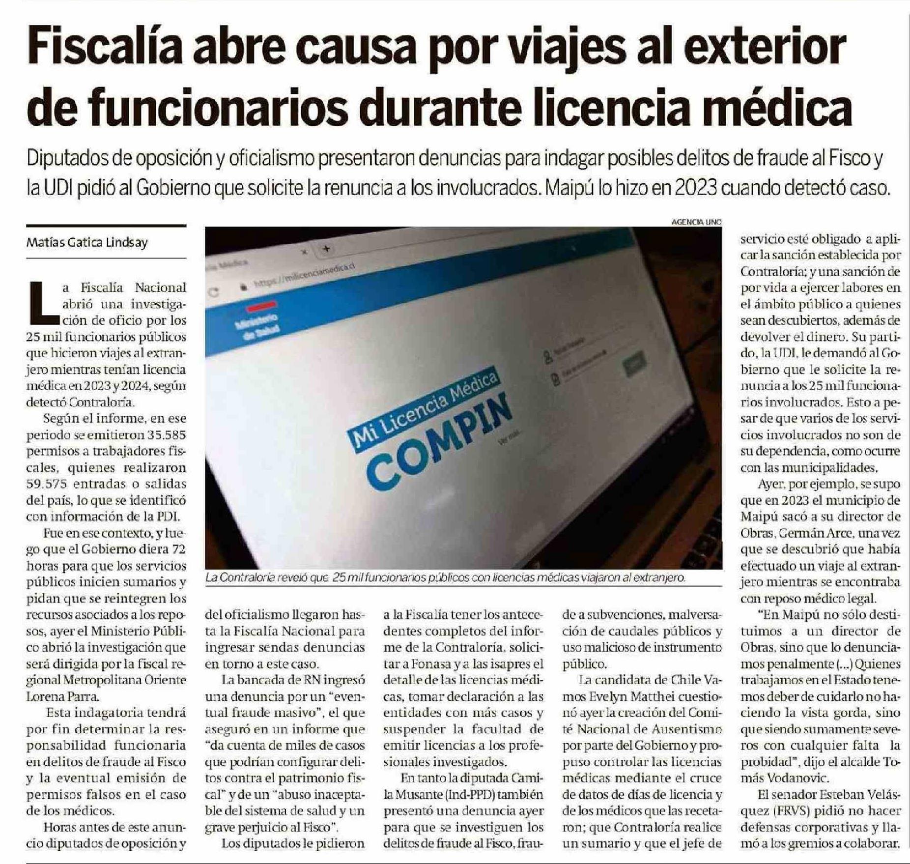 | Título: | Fiscalía abre causa por viajes al exterior de funcionarios durante licencia médica |
