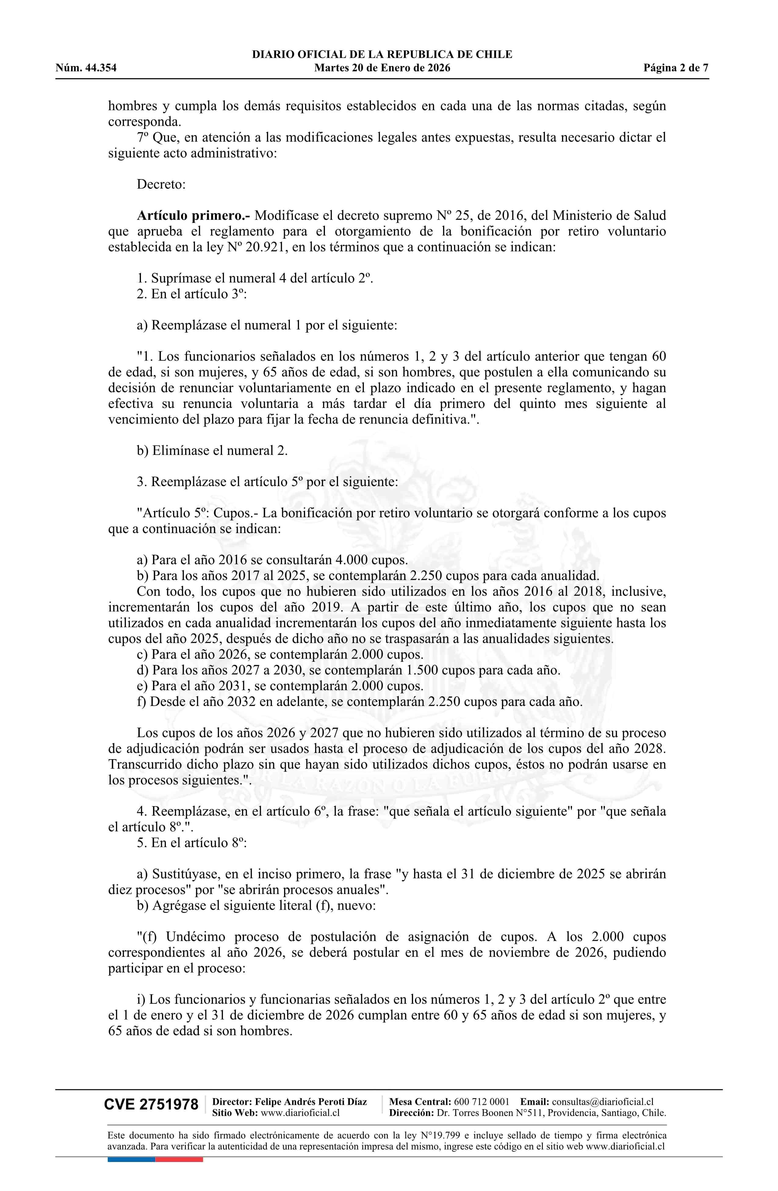 | Título: | Decreto número 17, de 2025.- Modifica decreto Nº 25, de 2016, reglamento para el otorgamiento de la bonificación por retiro voluntario establecida en la Ley Nº 20.921 |