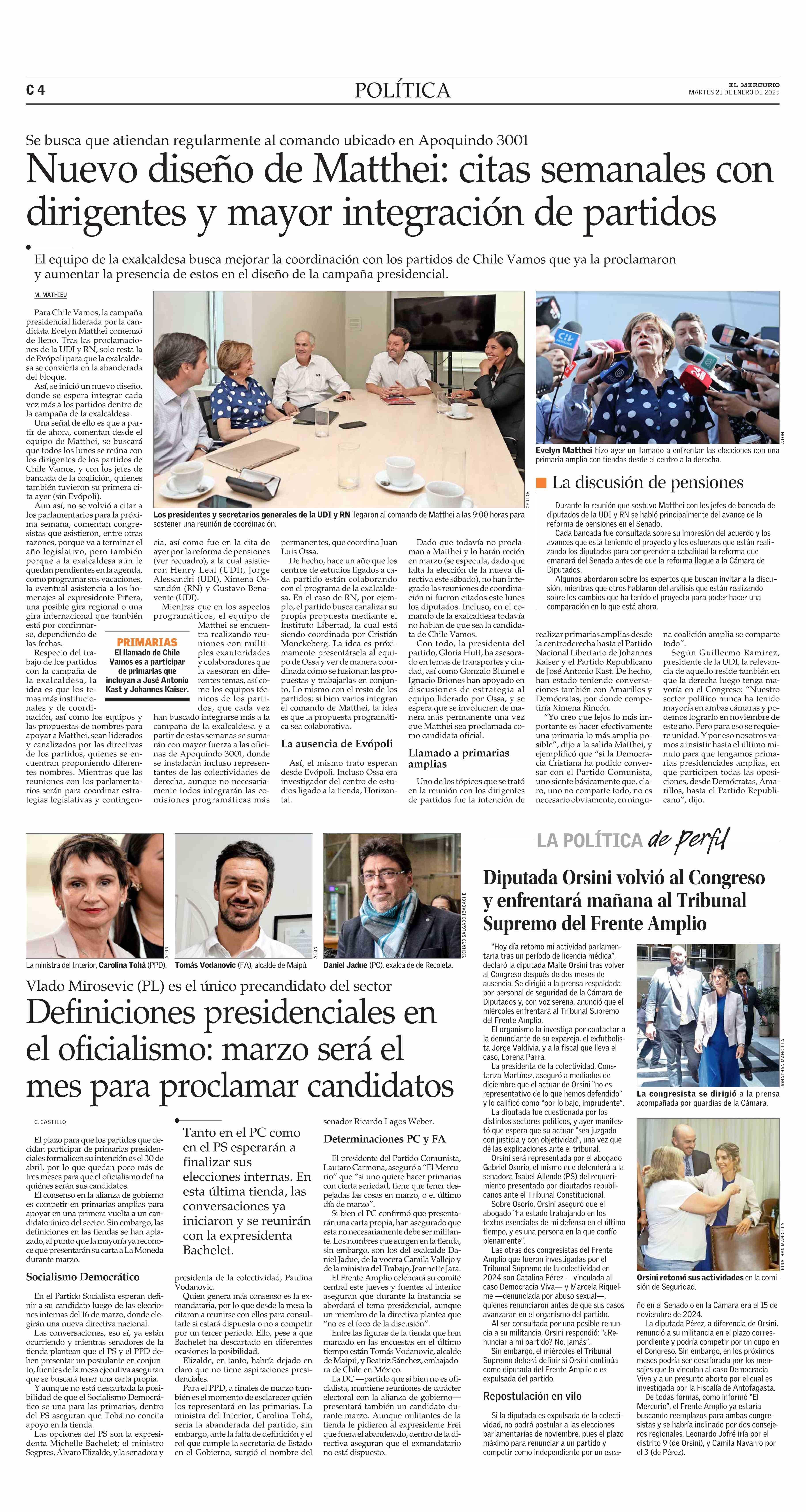 Nuevo diseño de Matthei: citas semanales con dirigentes y mayor integración de partidos 21-01-2025 El Mercurio |