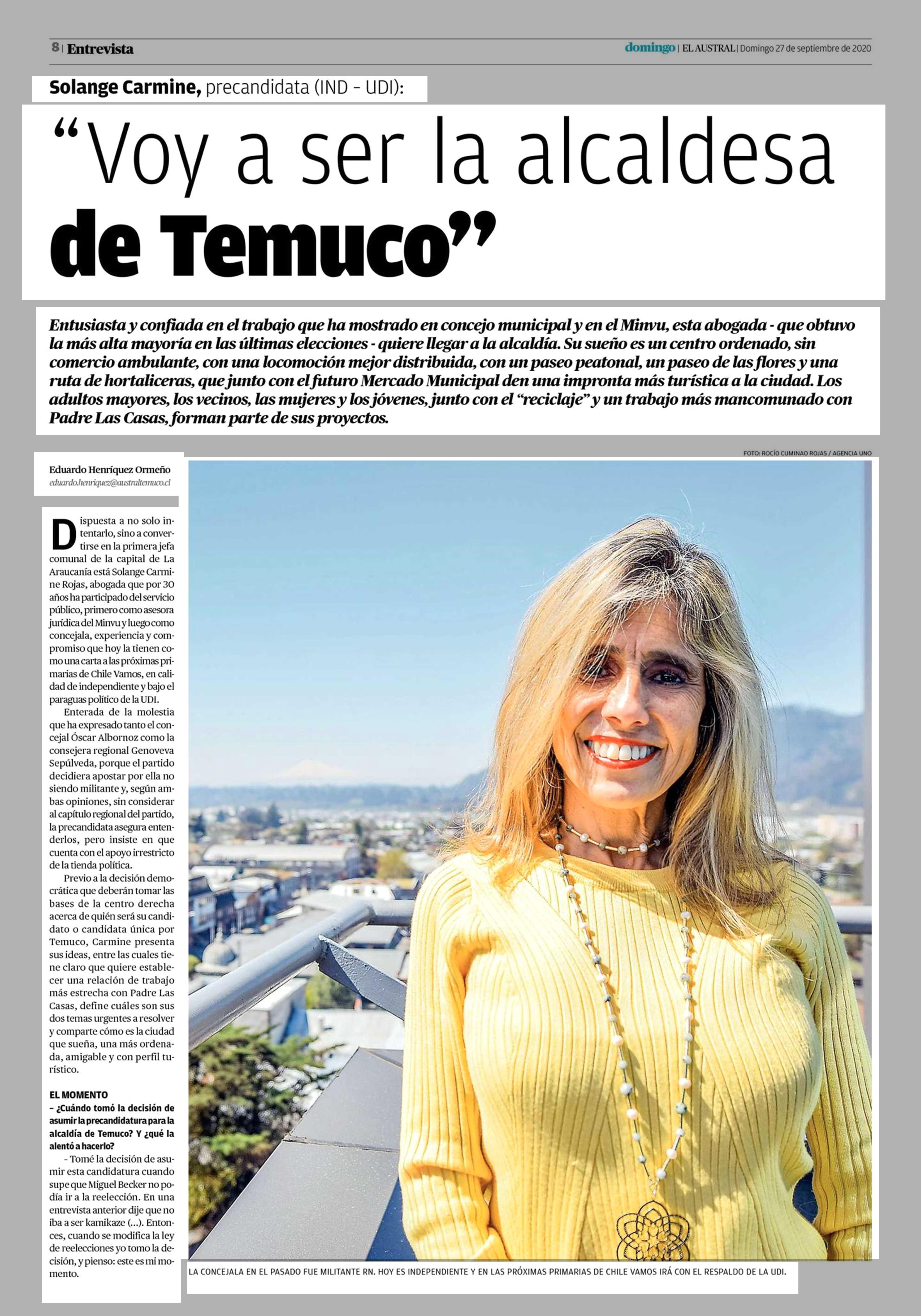 “Voy a ser la alcaldesa de Temuco” 27-09-2020 El Austral de la Araucanía |