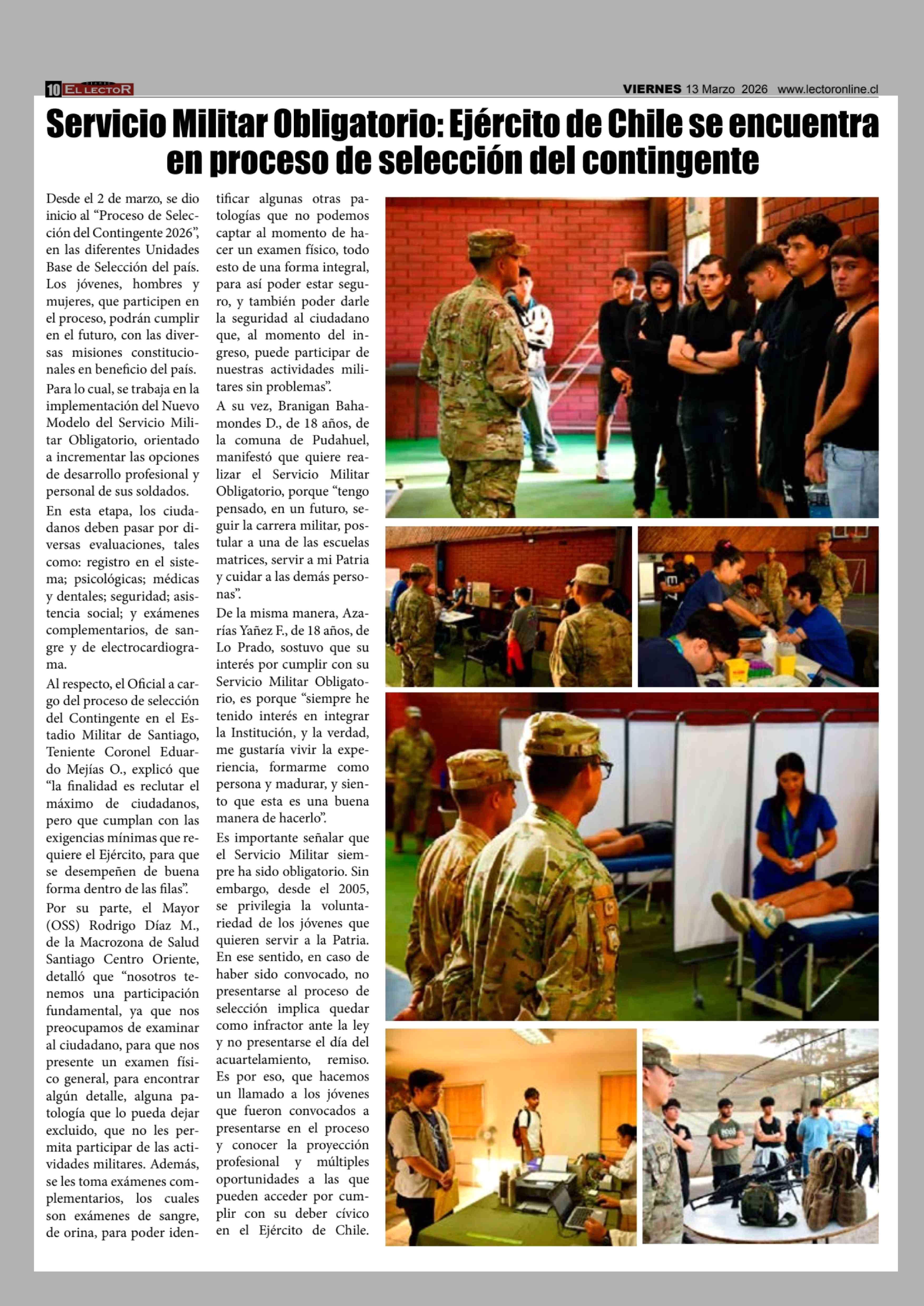 Servicio Militar Obligatorio: Ejército de Chile se encuentra en proceso de selección del contingente 13-03-2026 El Lector |