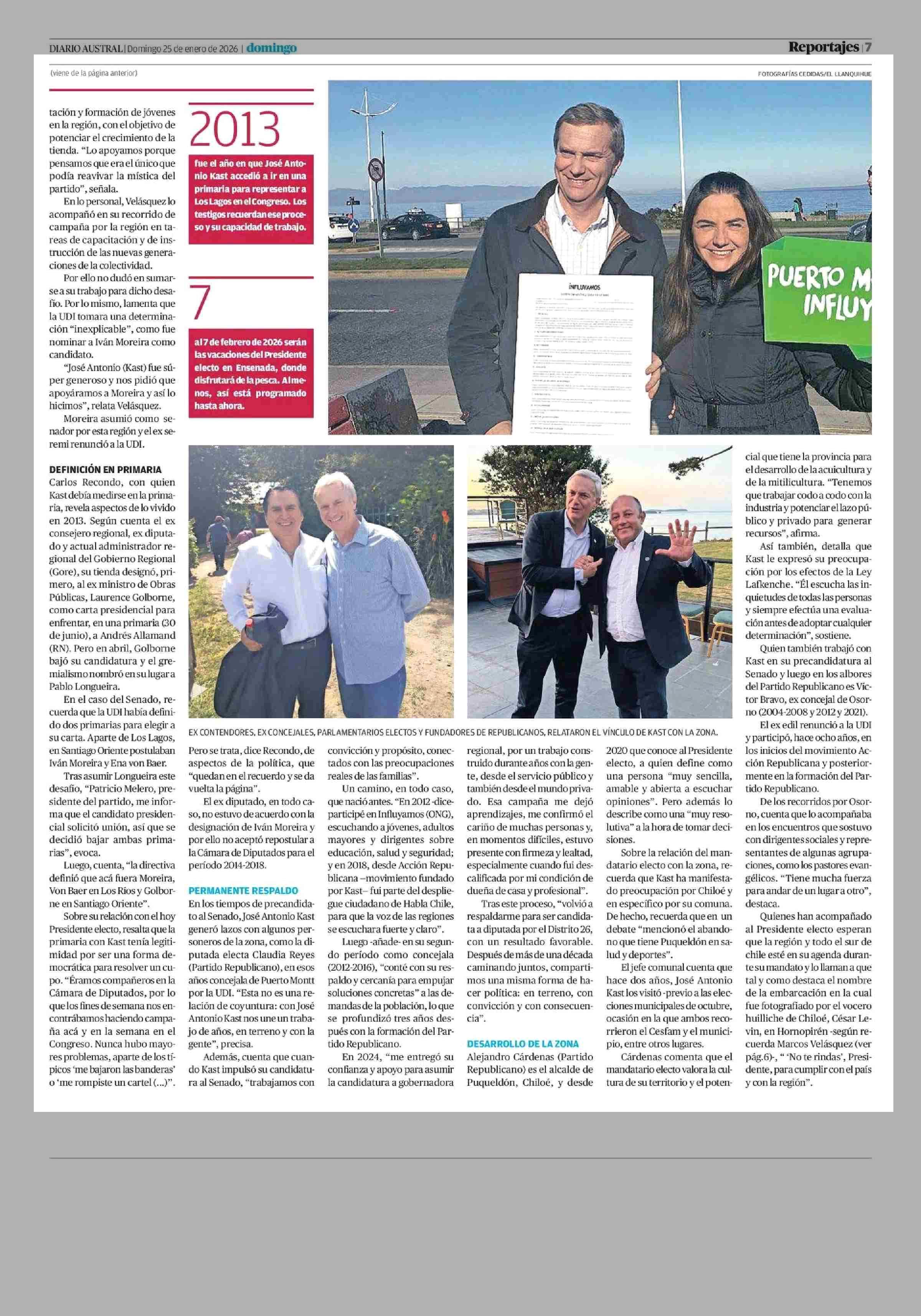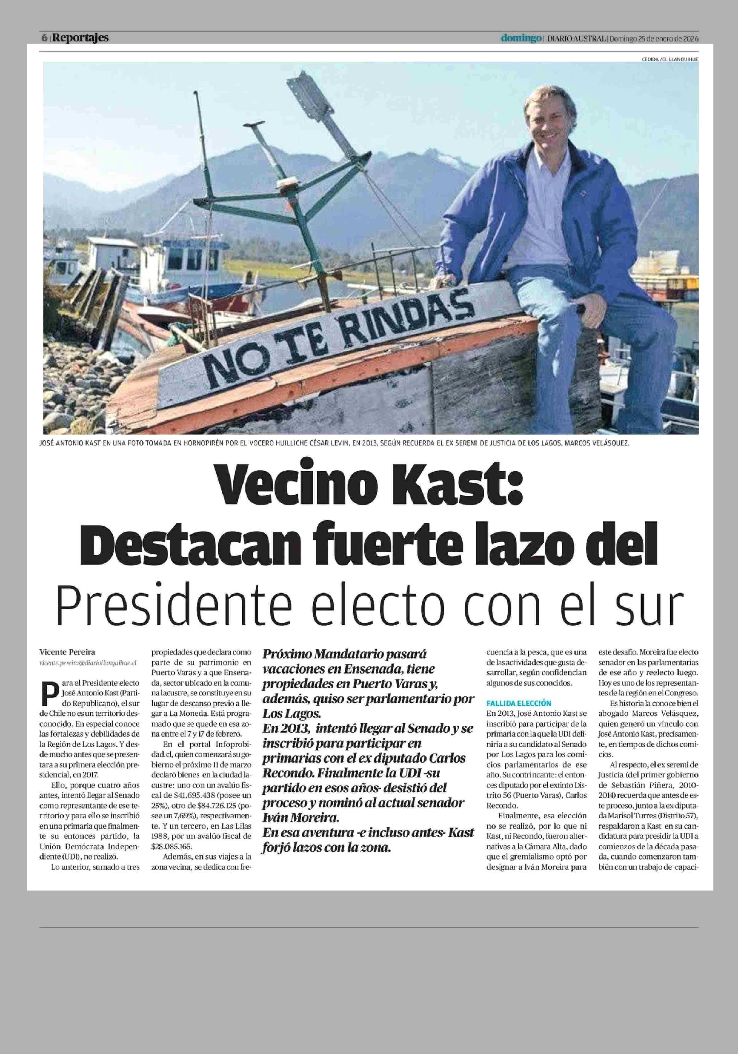 Vecino Kast: Destacan fuerte lazo del Presidente electo con el sur 25-01-2026 Diario Austral Región de Los Ríos |