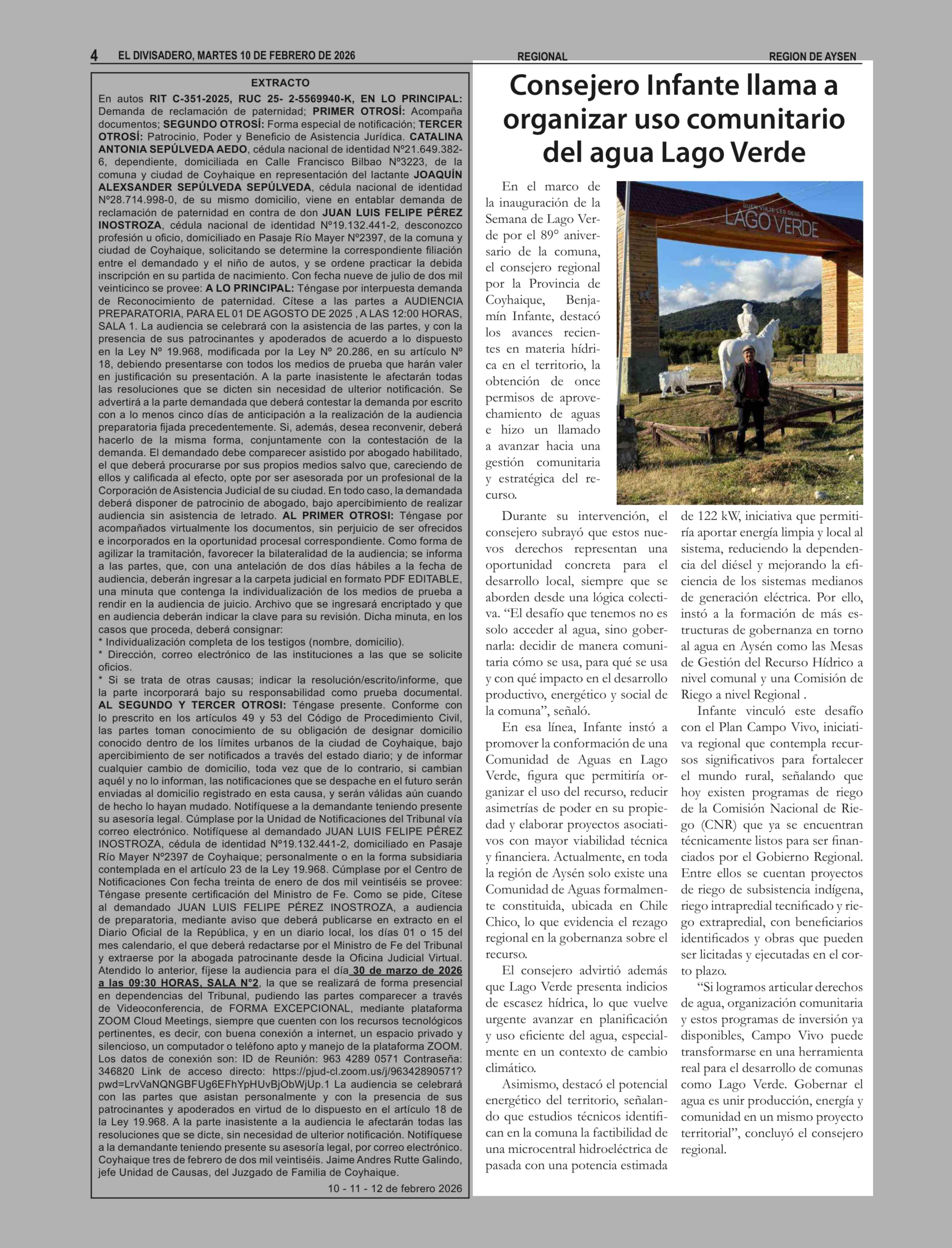 Consejero Infante llama a organizar uso comunitario del agua Lago Verde 10-02-2026 El Divisadero |