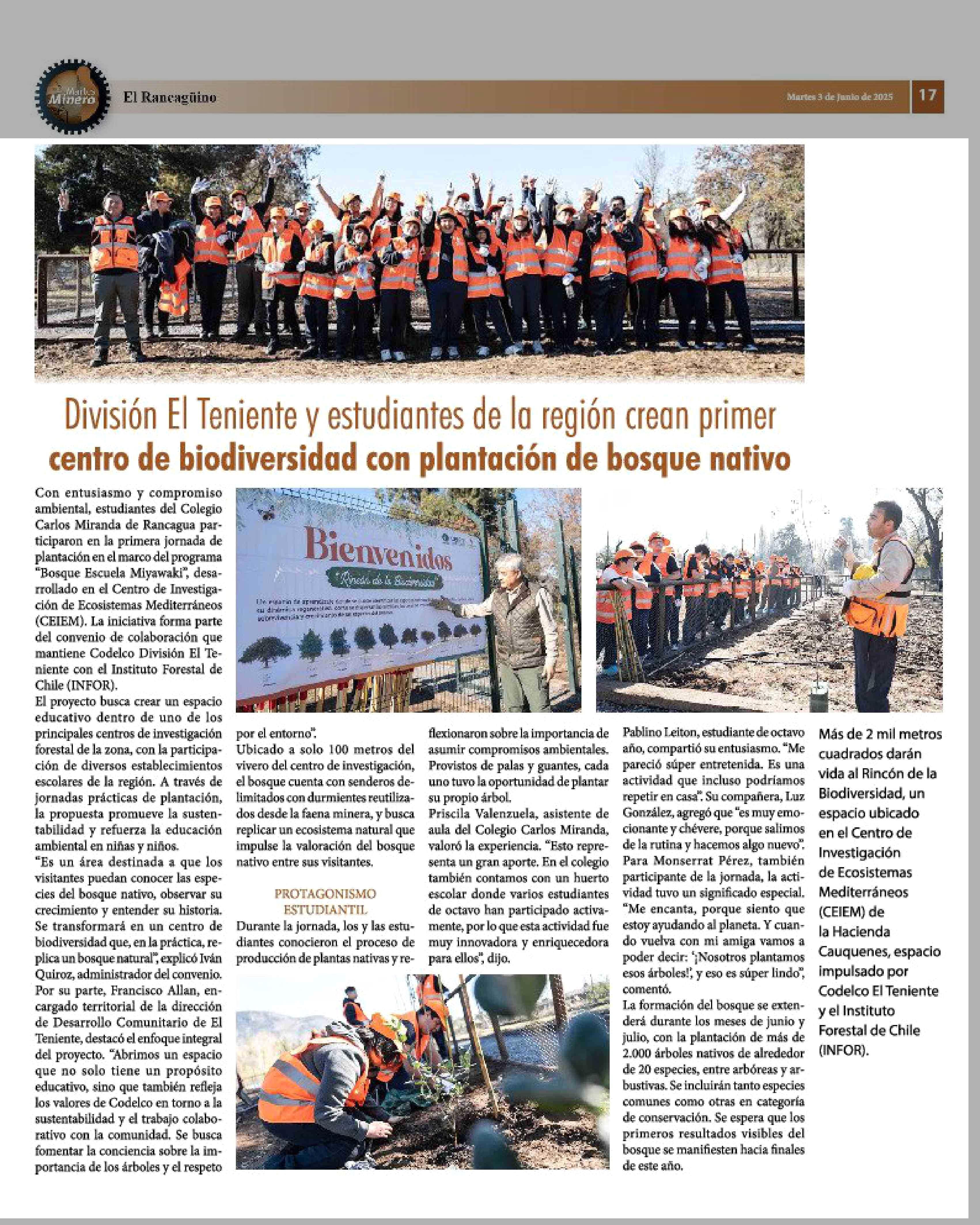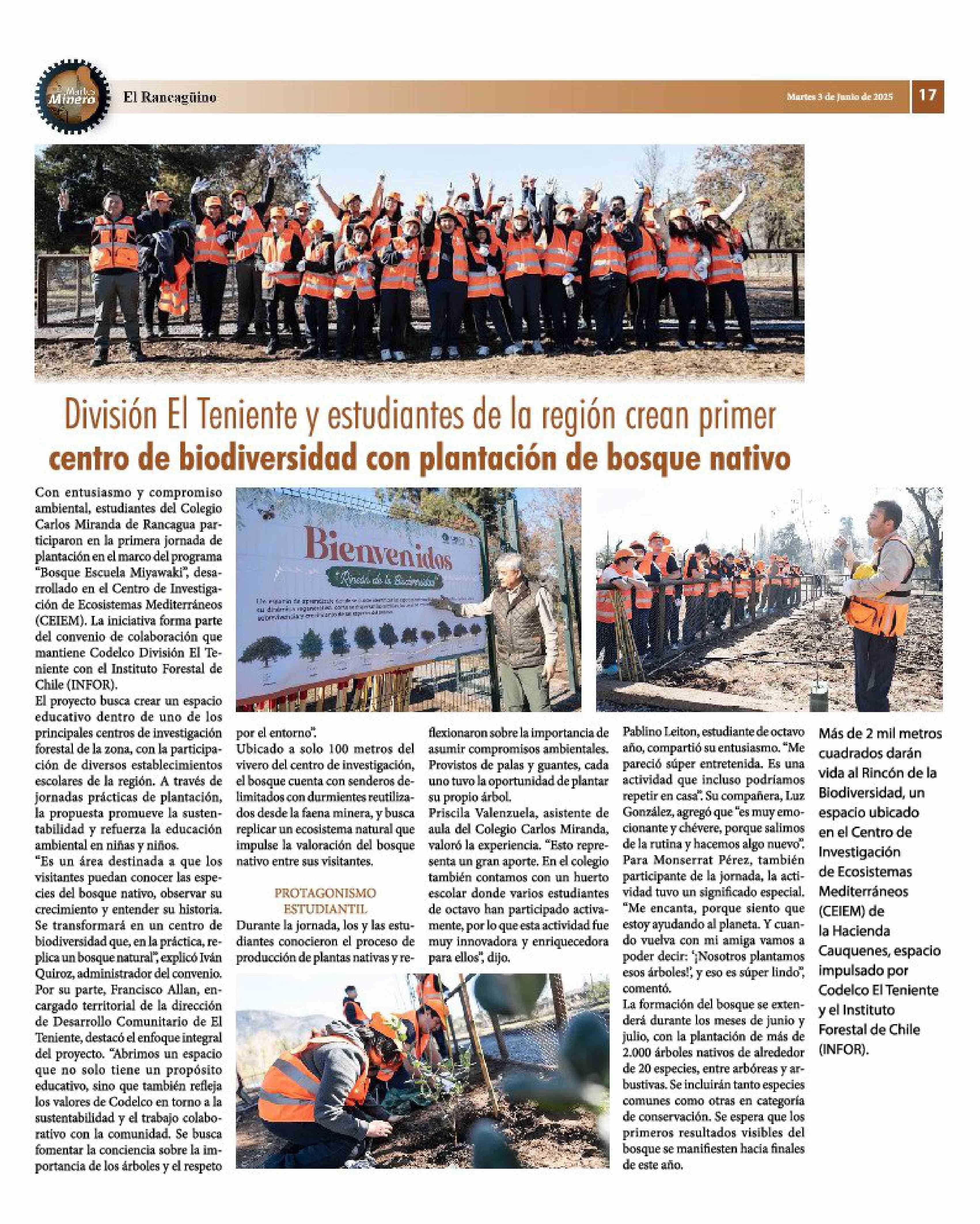 Division El leniente y estudiantes de la región crean primer centro de biodiversidad con plantación de bosque nativo 03-06-2025 El Rancagüino |