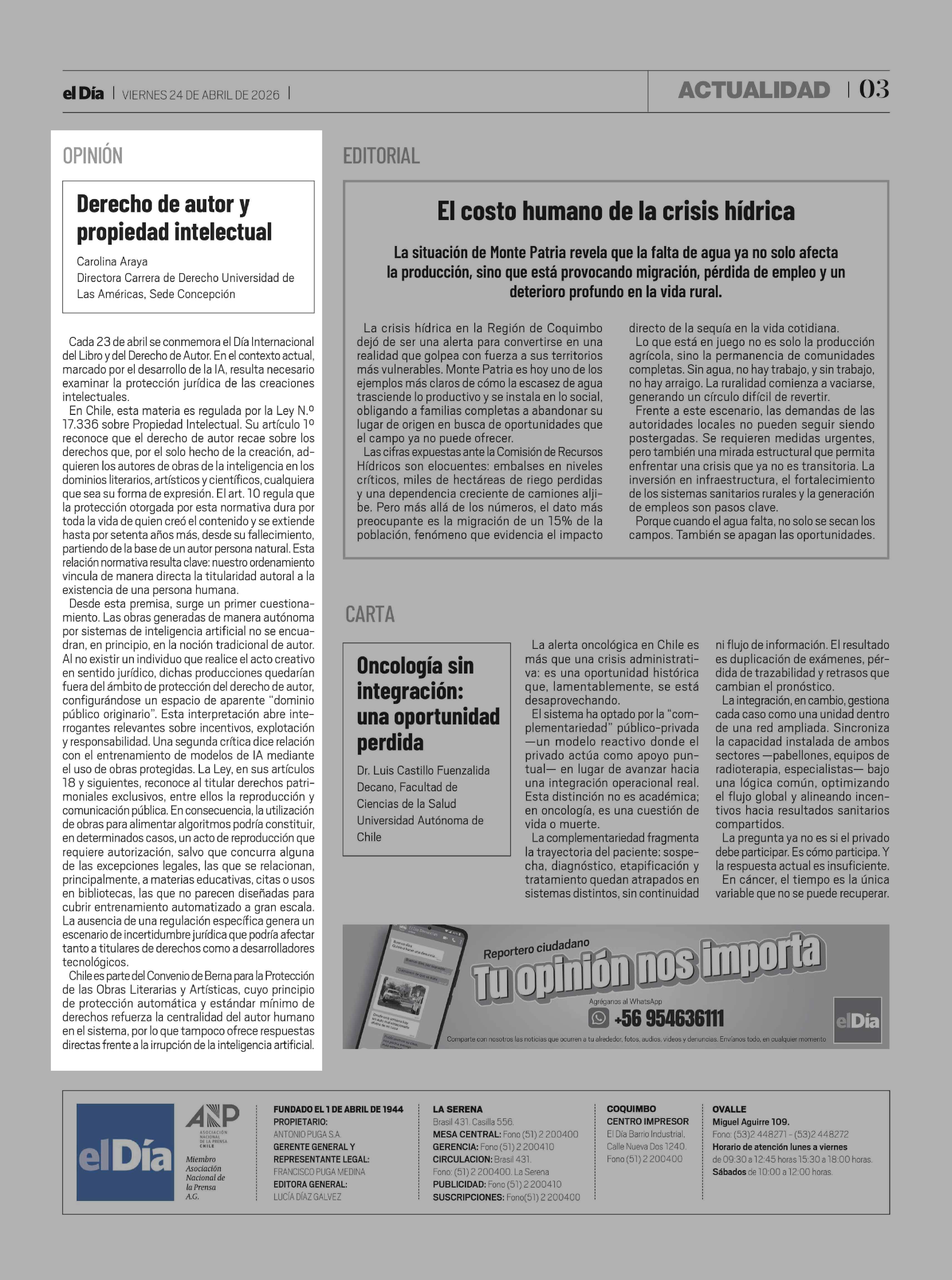 Columnas de Opinión: Derecho de autor y propiedad intelectual 24-04-2026 El Día |