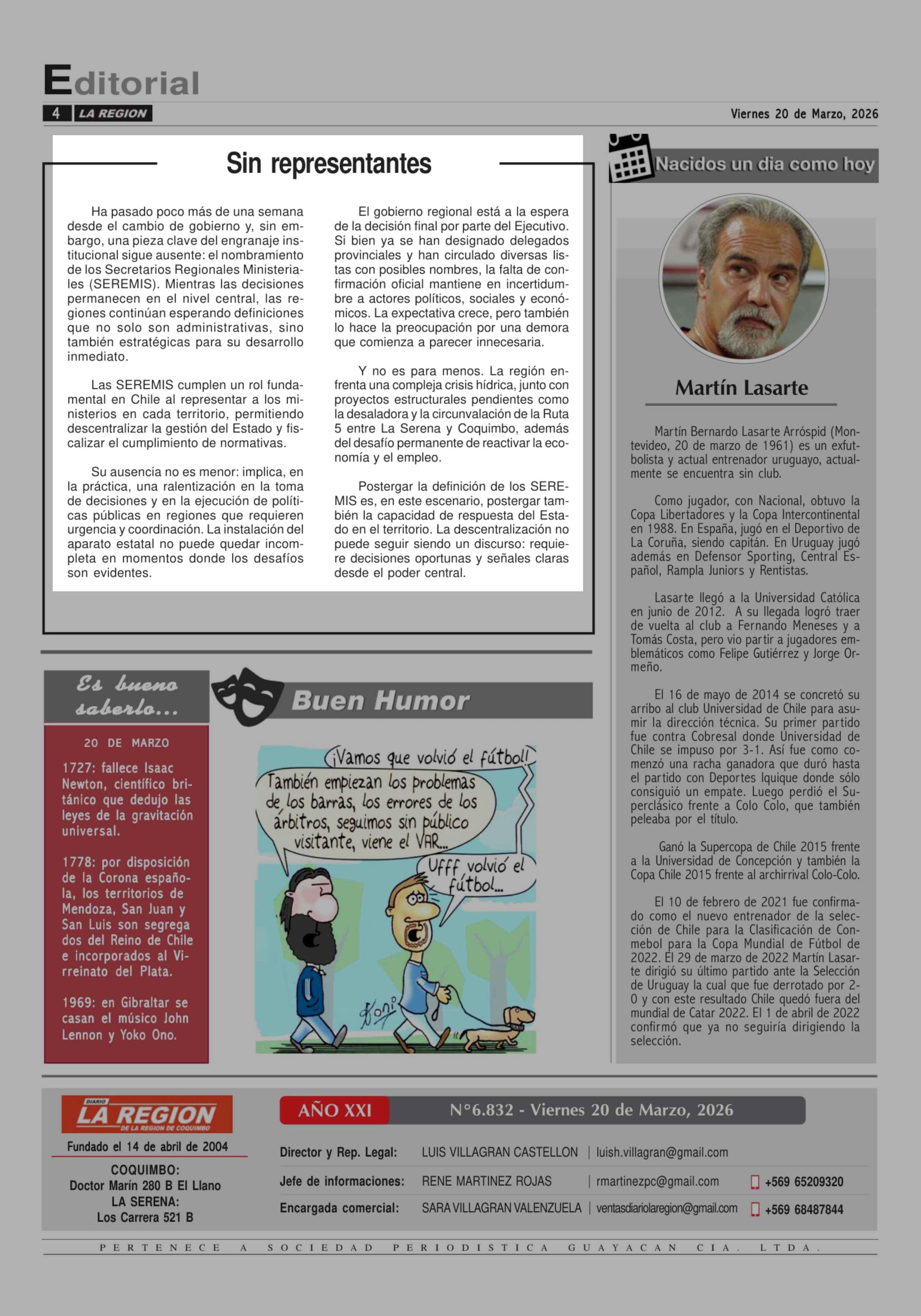 Editorial: Sin representantes 20-03-2026 Diario la Región |