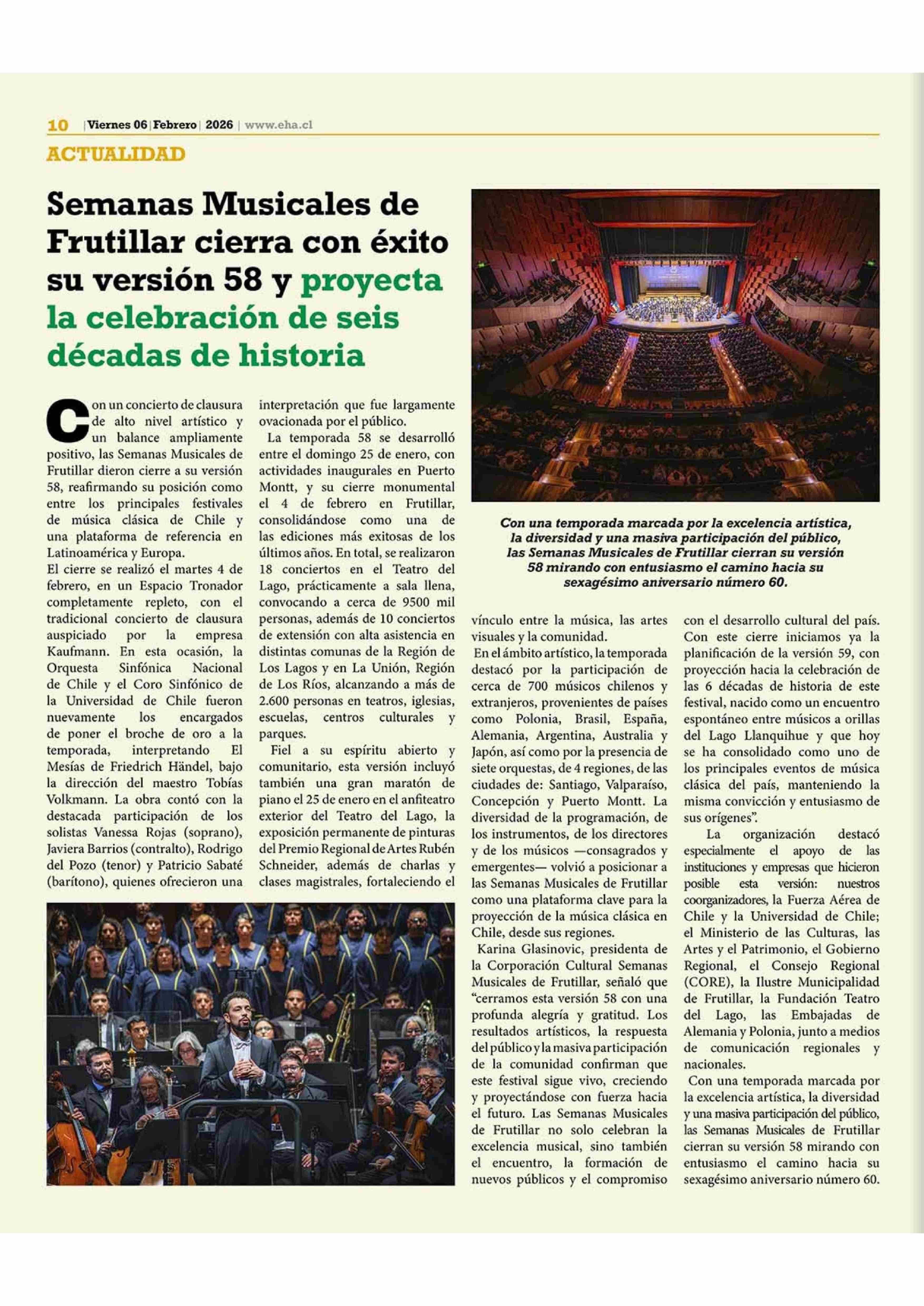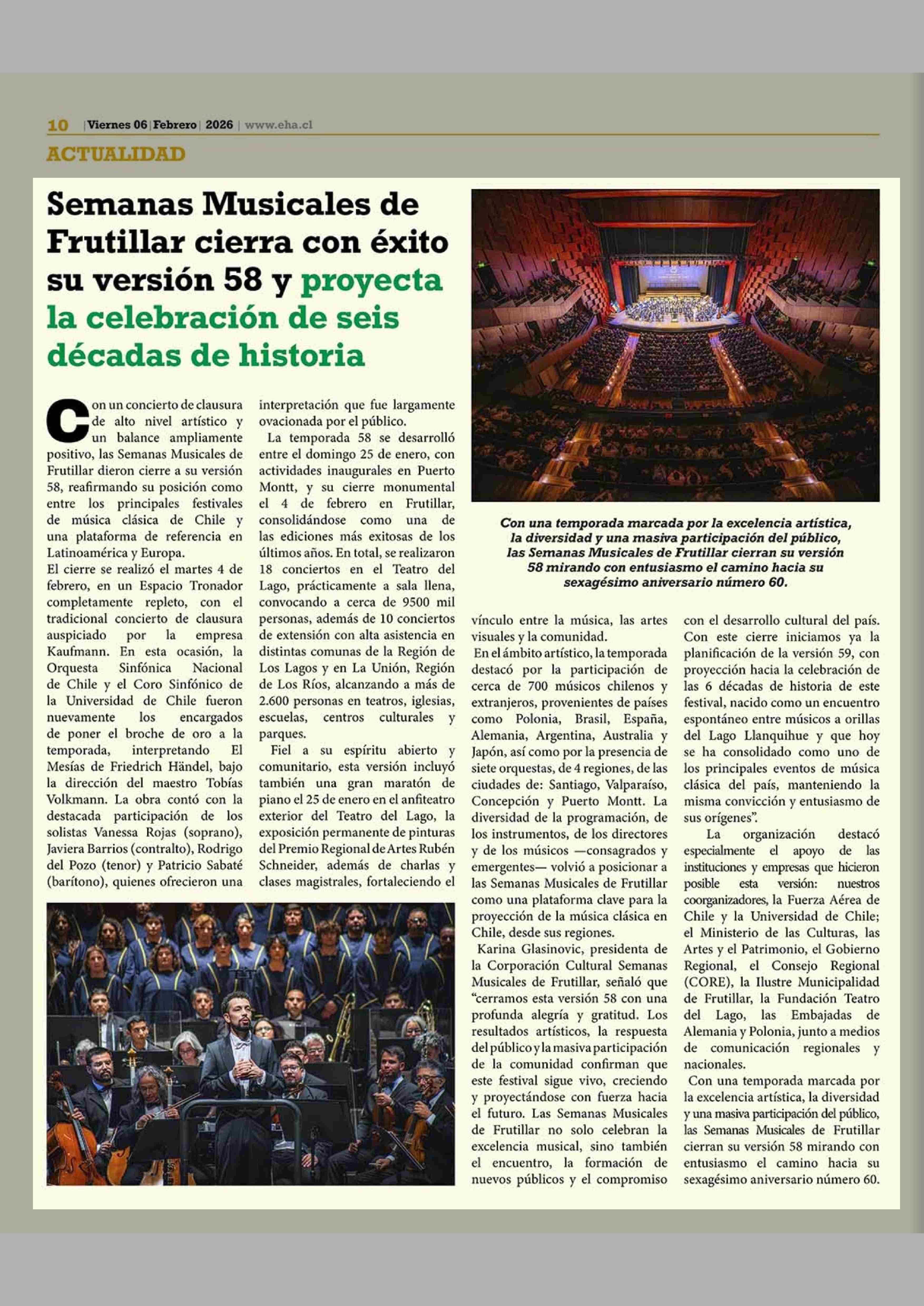 Semanas Musicales de Frutillar cierra con éxito su versión 58 y proyecta la celebración de seis décadas de historia 06-02-2026 El Heraldo Austral |
