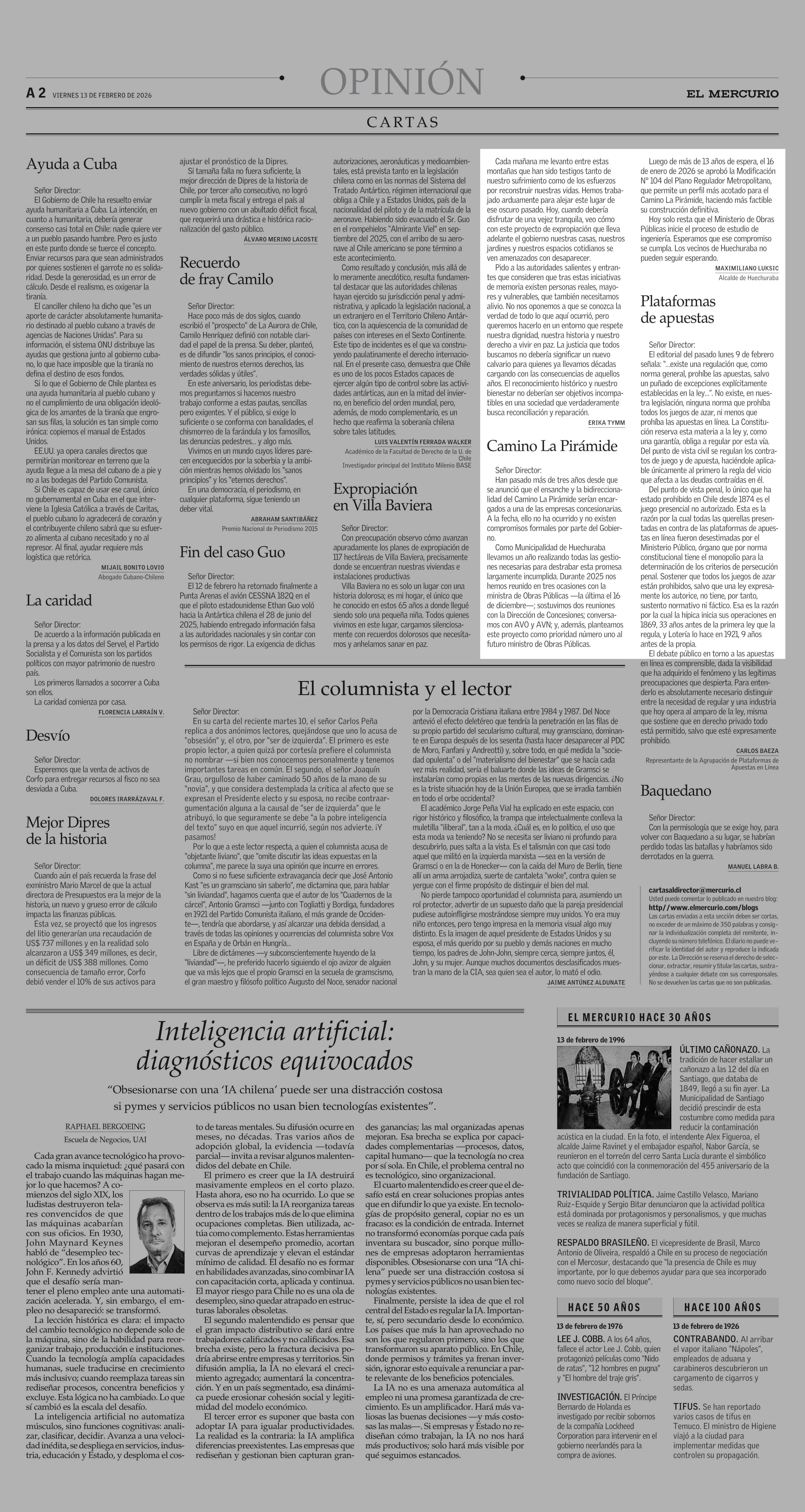 Cartas: Camino La Pirámide 13-02-2026 El Mercurio |