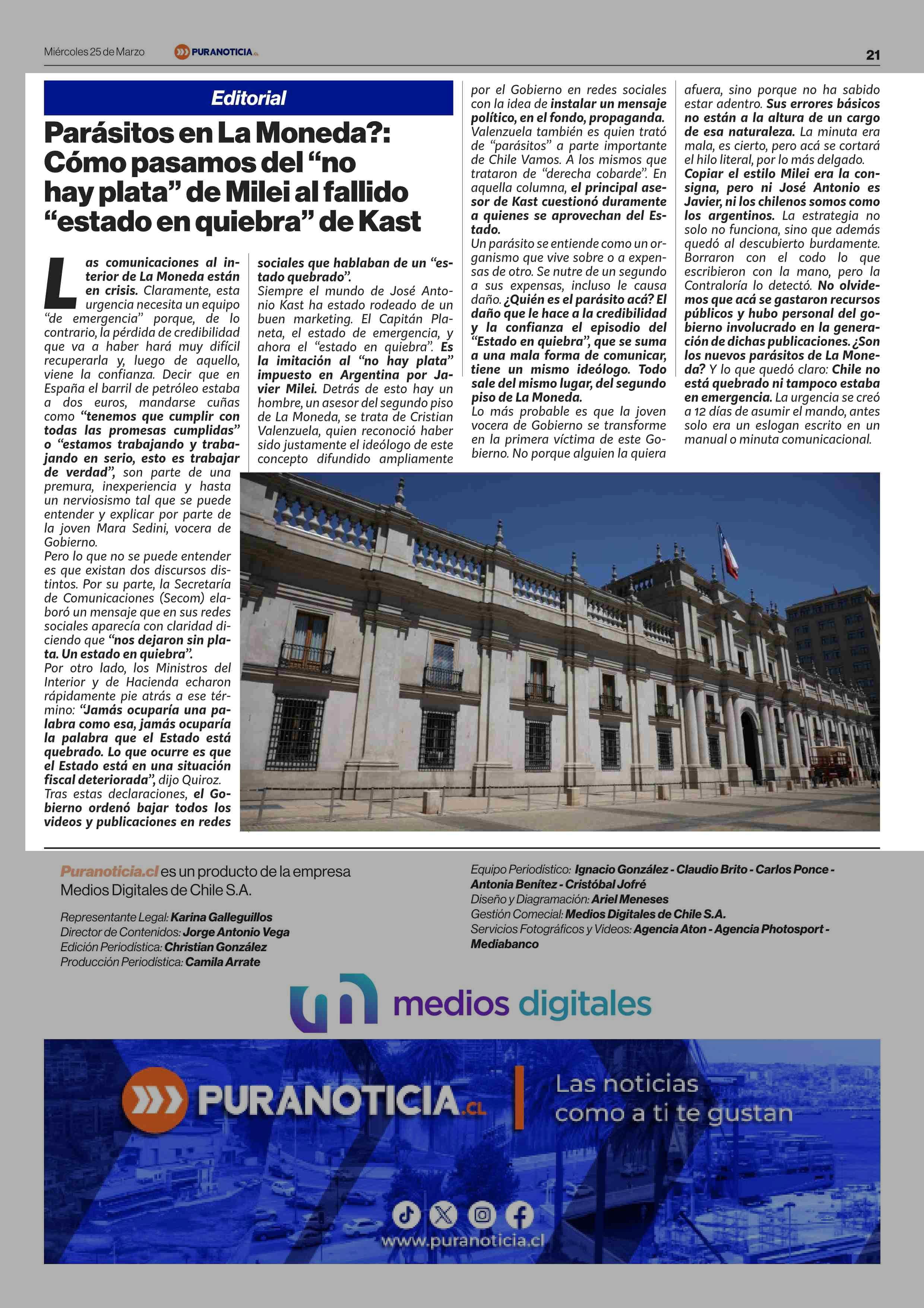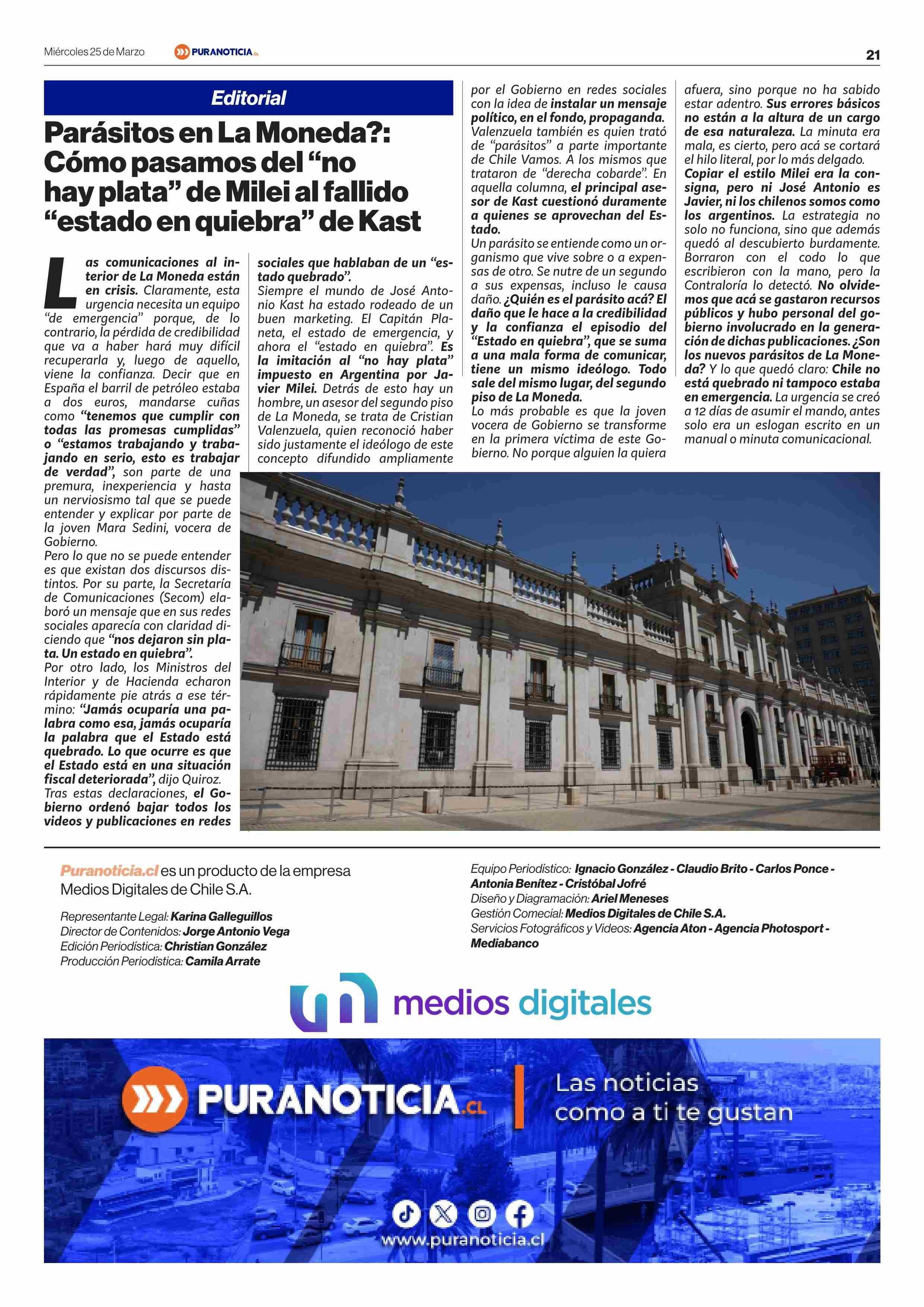Título: EDITORIAL: Cómo pasamos del “no hay plata” de Milei al fallido “estado en quiebra” de Kast