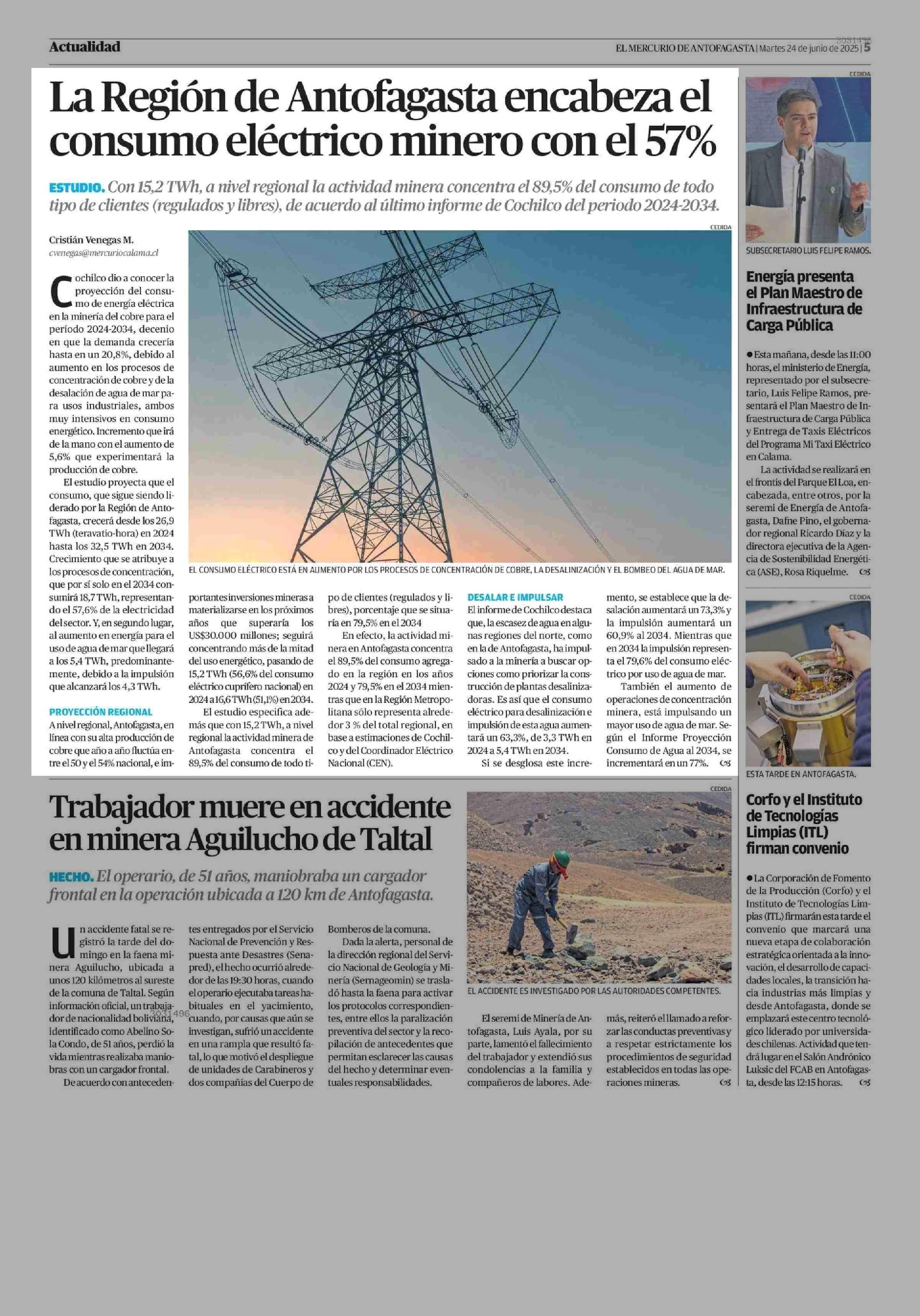 La Región de Antofagasta encabeza el consumo eléctrico minero con el 57% 24-06-2025 El Mercurio de Antofagasta |