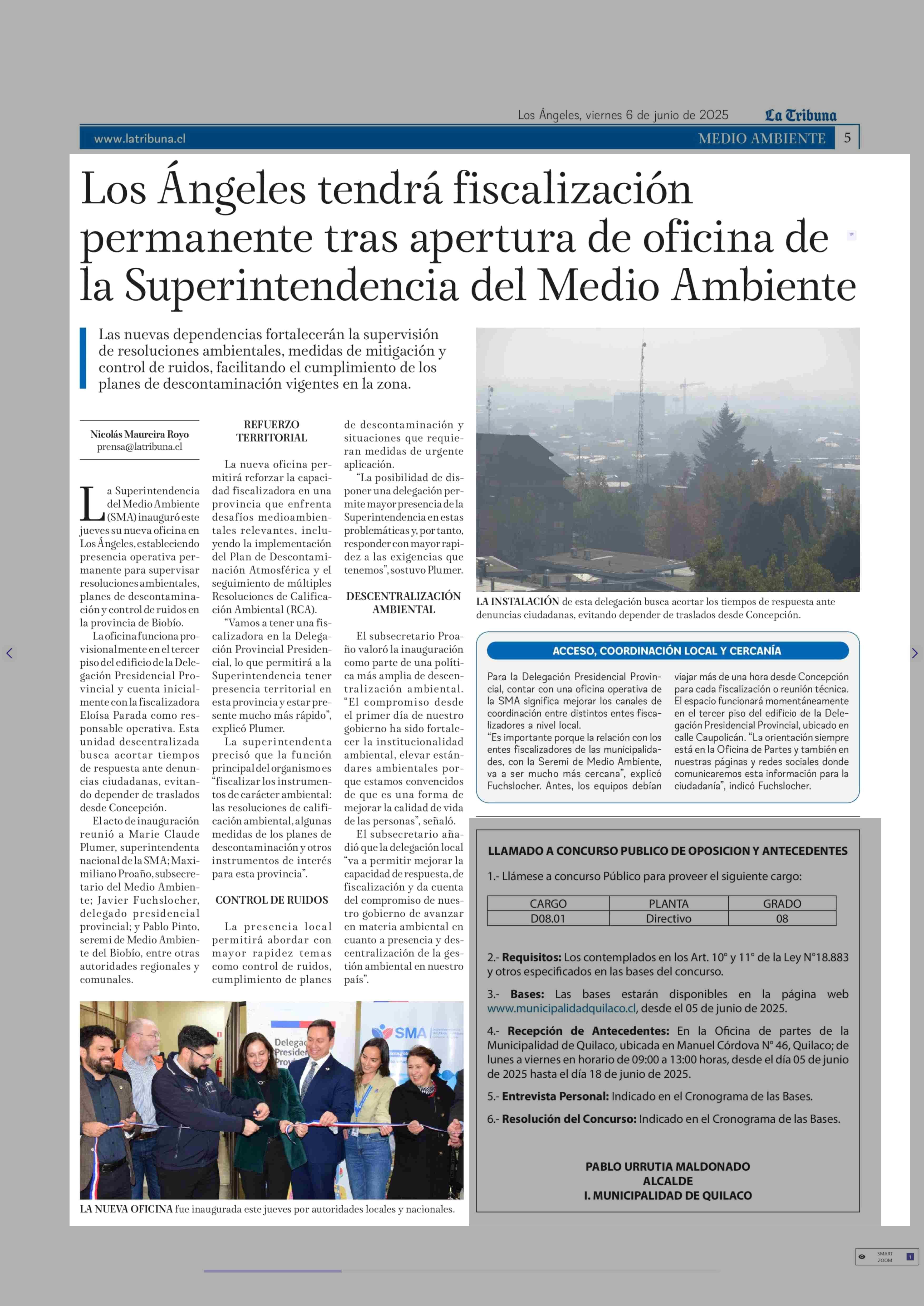 Los Angeles tendrá fiscalización tras apertura de oficina de la Superintendencia del Medio Ambiente 06-06-2025 La Tribuna |