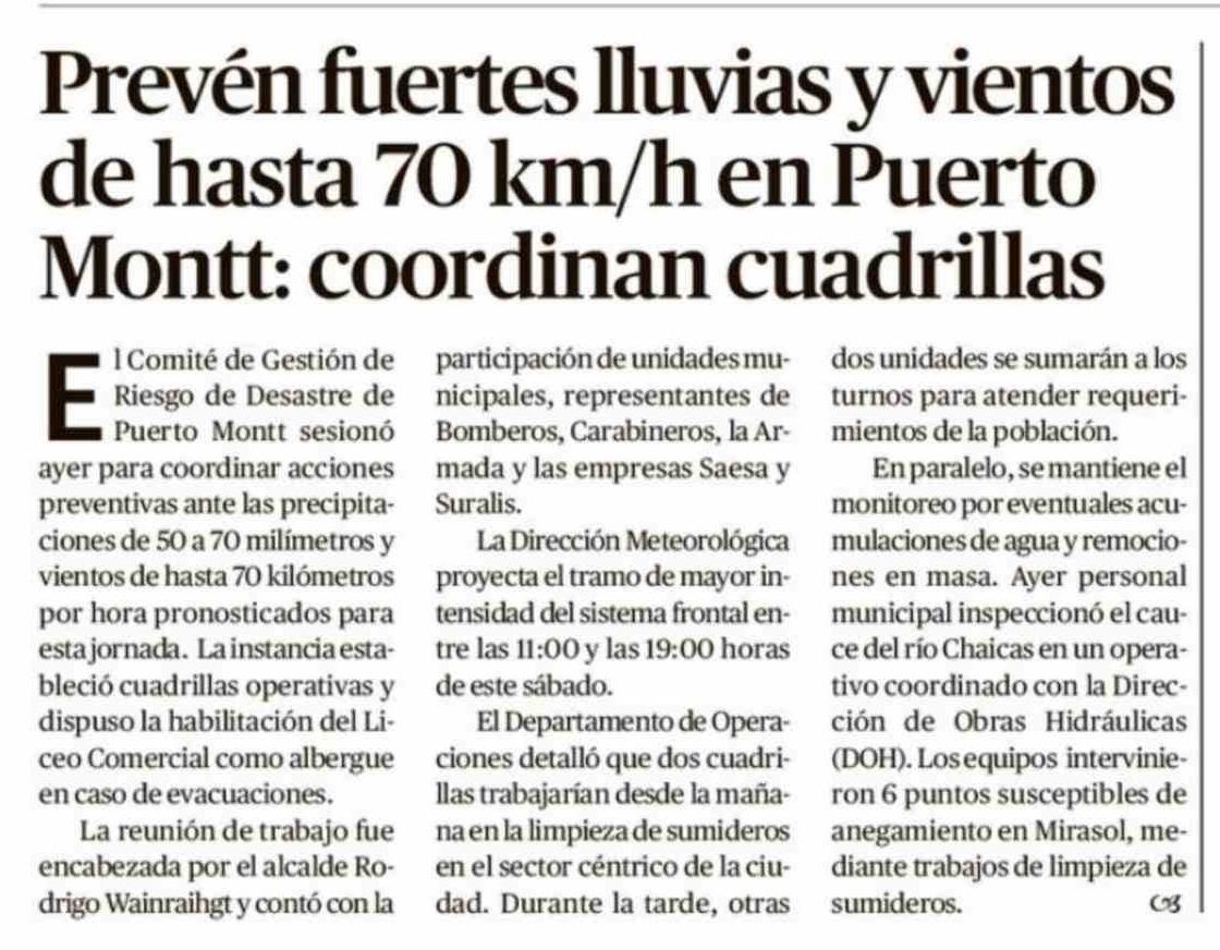 Título: Prevén fuertes lluvias y vientos de hasta 70 km/h en Puerto Montt: coordinan cuadrillas