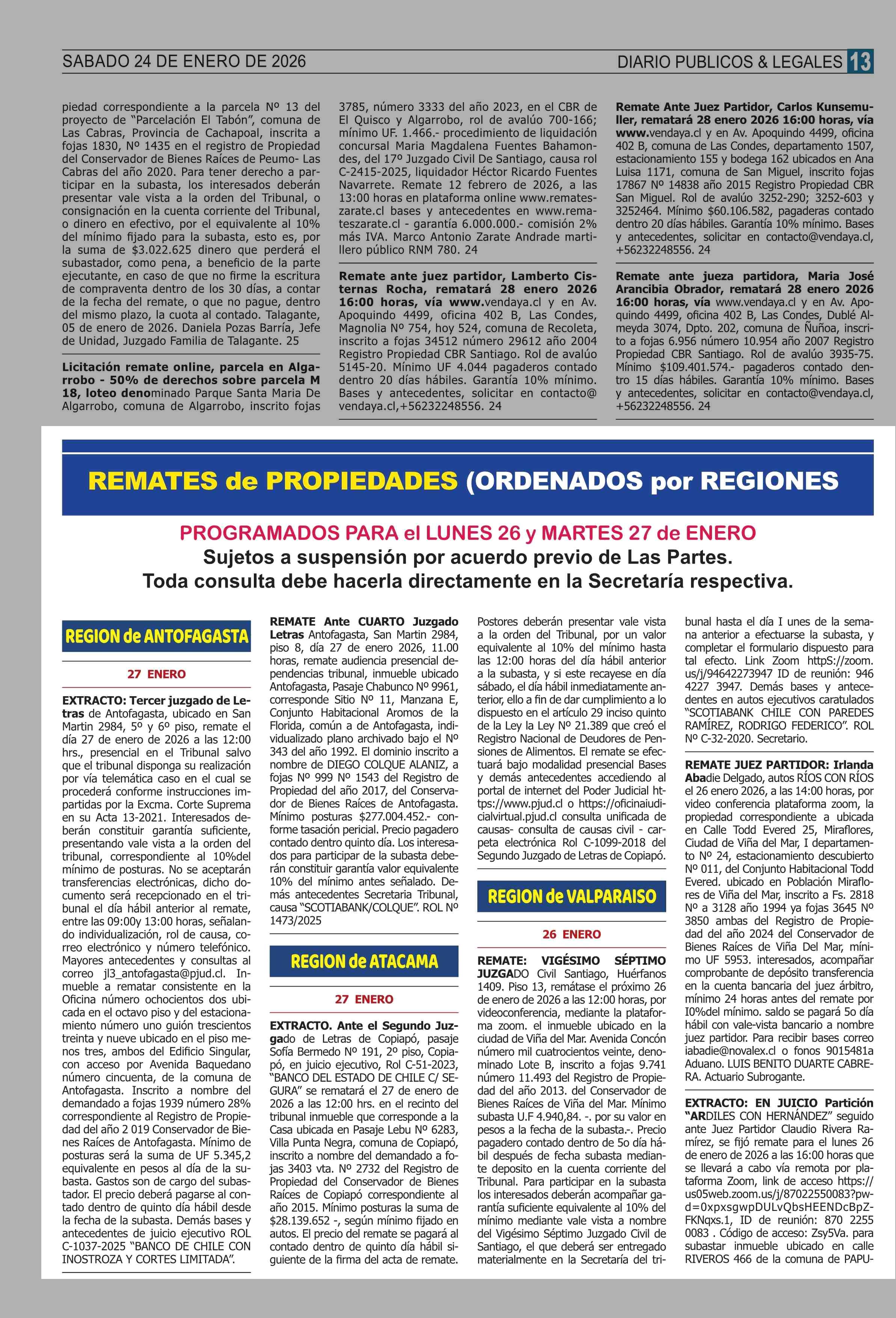 REMATES: REMATES de PROPIEDADES (ORDENADOS por REGIONES 24-01-2026 P&L Públicos y Legales |