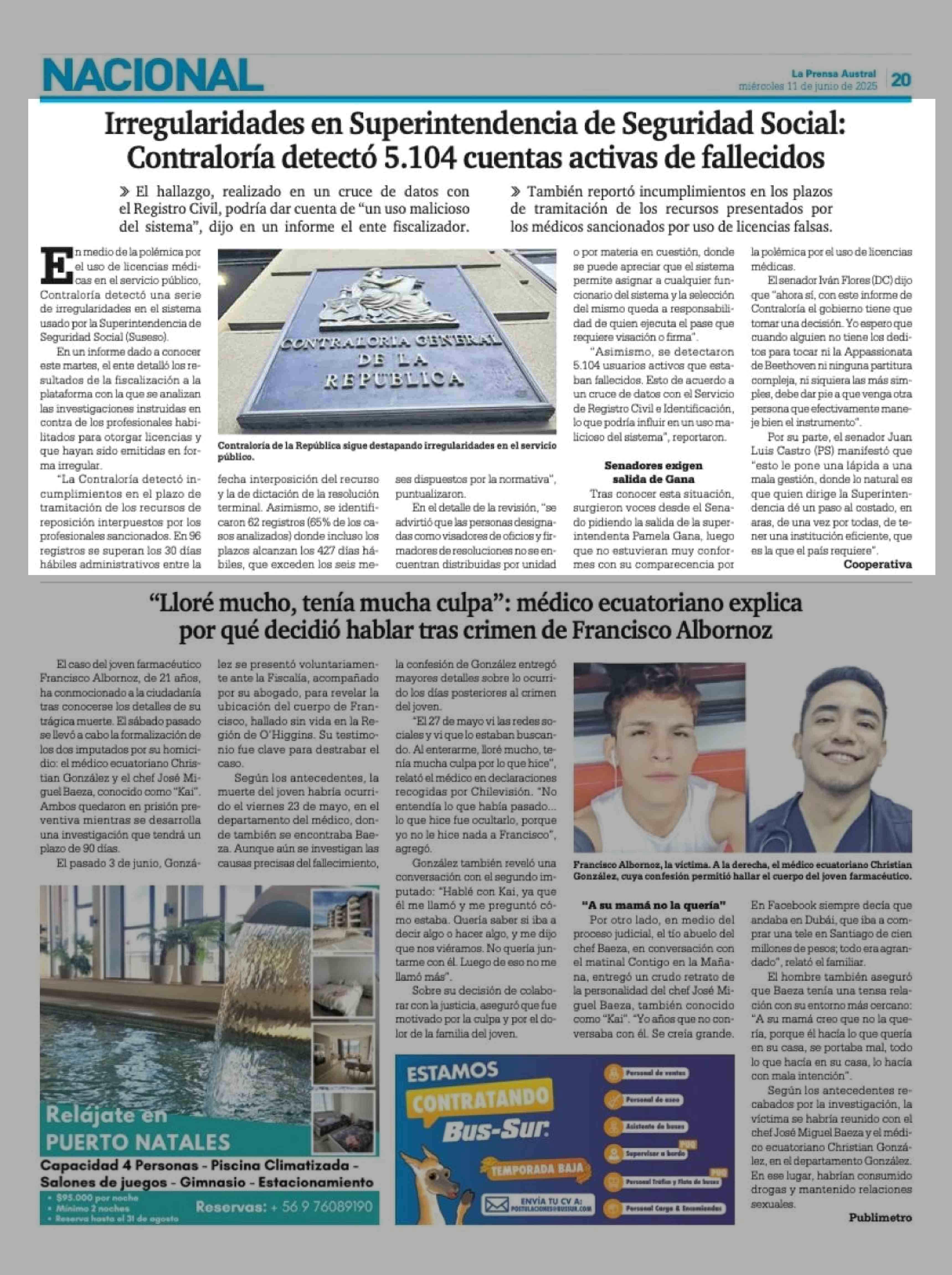 Irregularidades en Superintendencia de Seguridad Social: Contraloría detectó 5.104 cuentas activas de fallecidos 11-06-2025 La Prensa Austral |