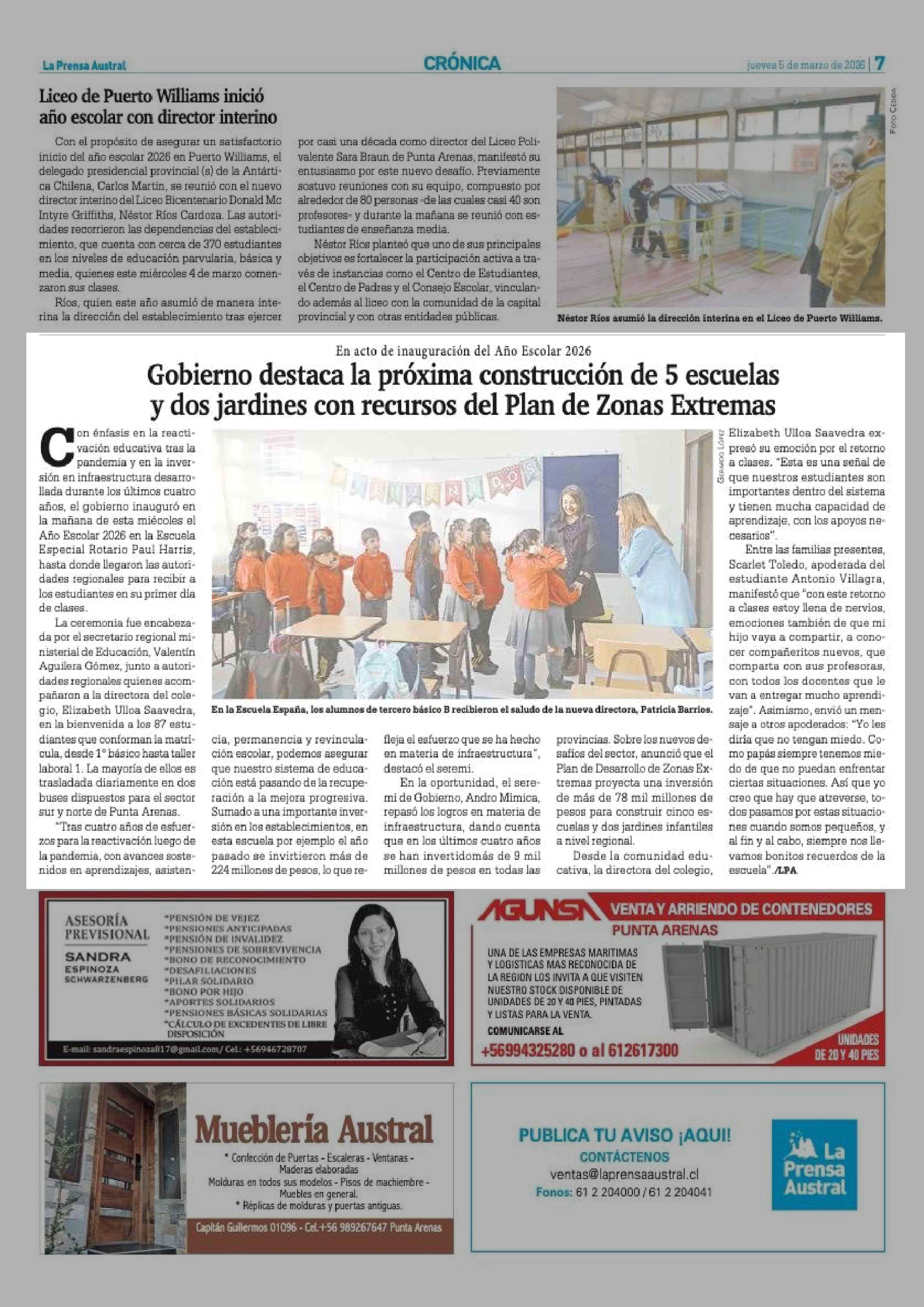 Gobierno destaca la próxima construcción de 5 escuelas y dos jardines con recursos del Plan de Zonas Extremas 05-03-2026 La Prensa Austral |