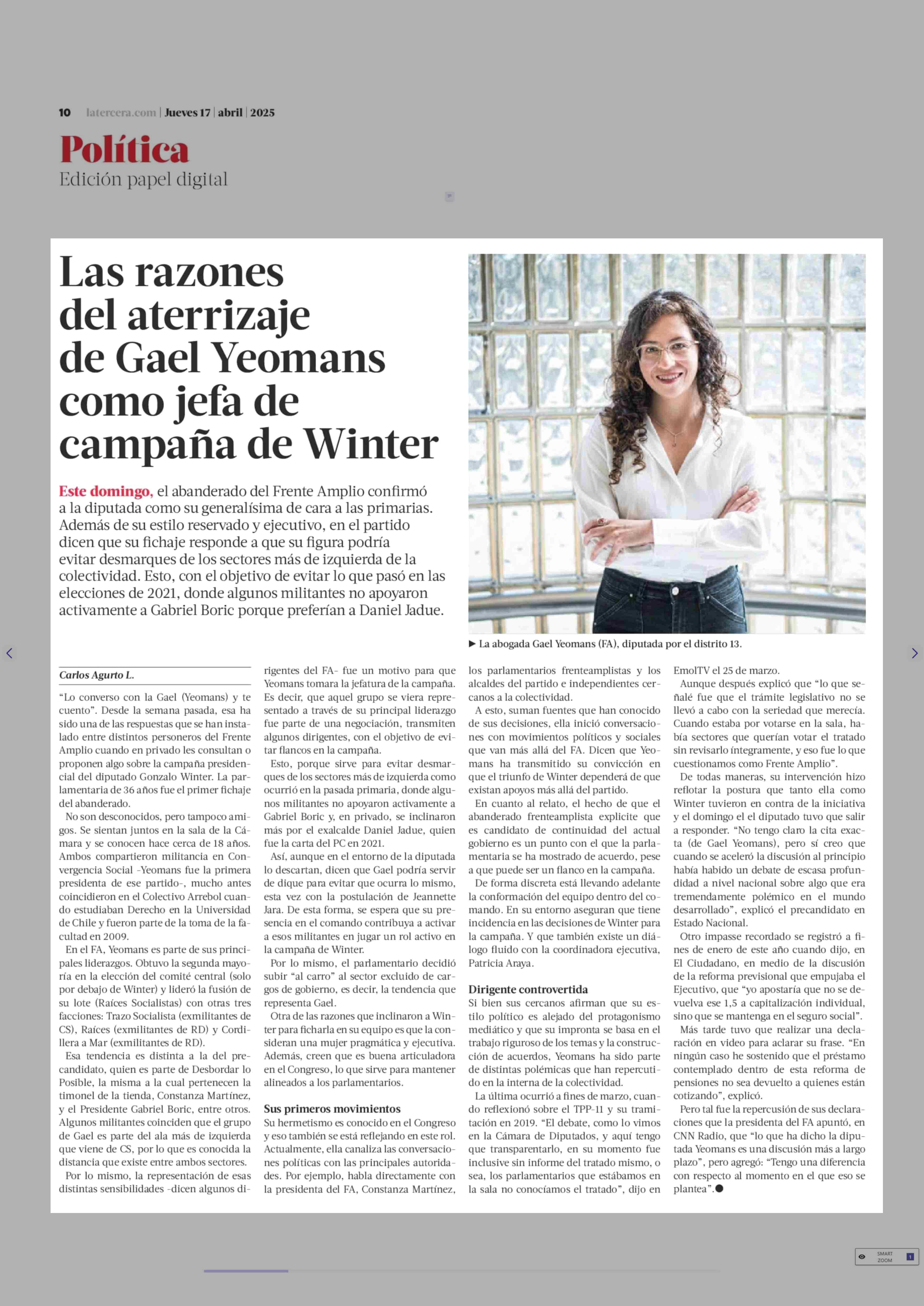 Las razones del aterrizaje de Gael Yeomans como jefa de campaña de Winter 17-04-2025 La Tercera |