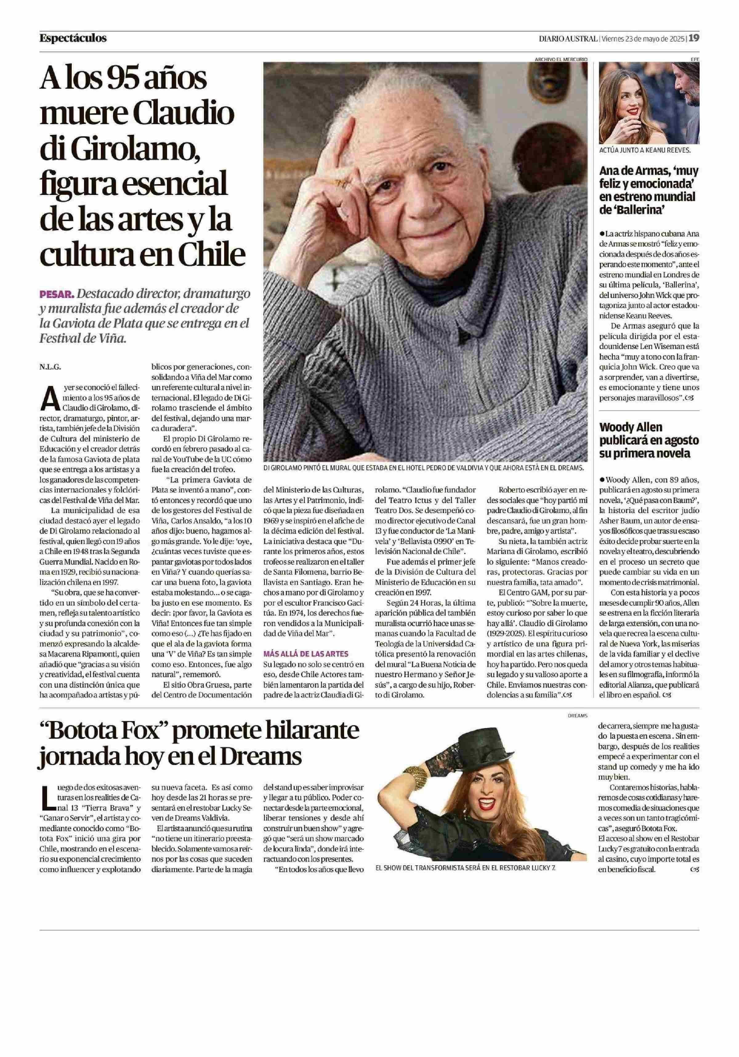 Alos 95 años muere Claudio di Girolamo, figura esencial de las artes y la cultura en Chile 23-05-2025 Diario Austral Región de Los Ríos |