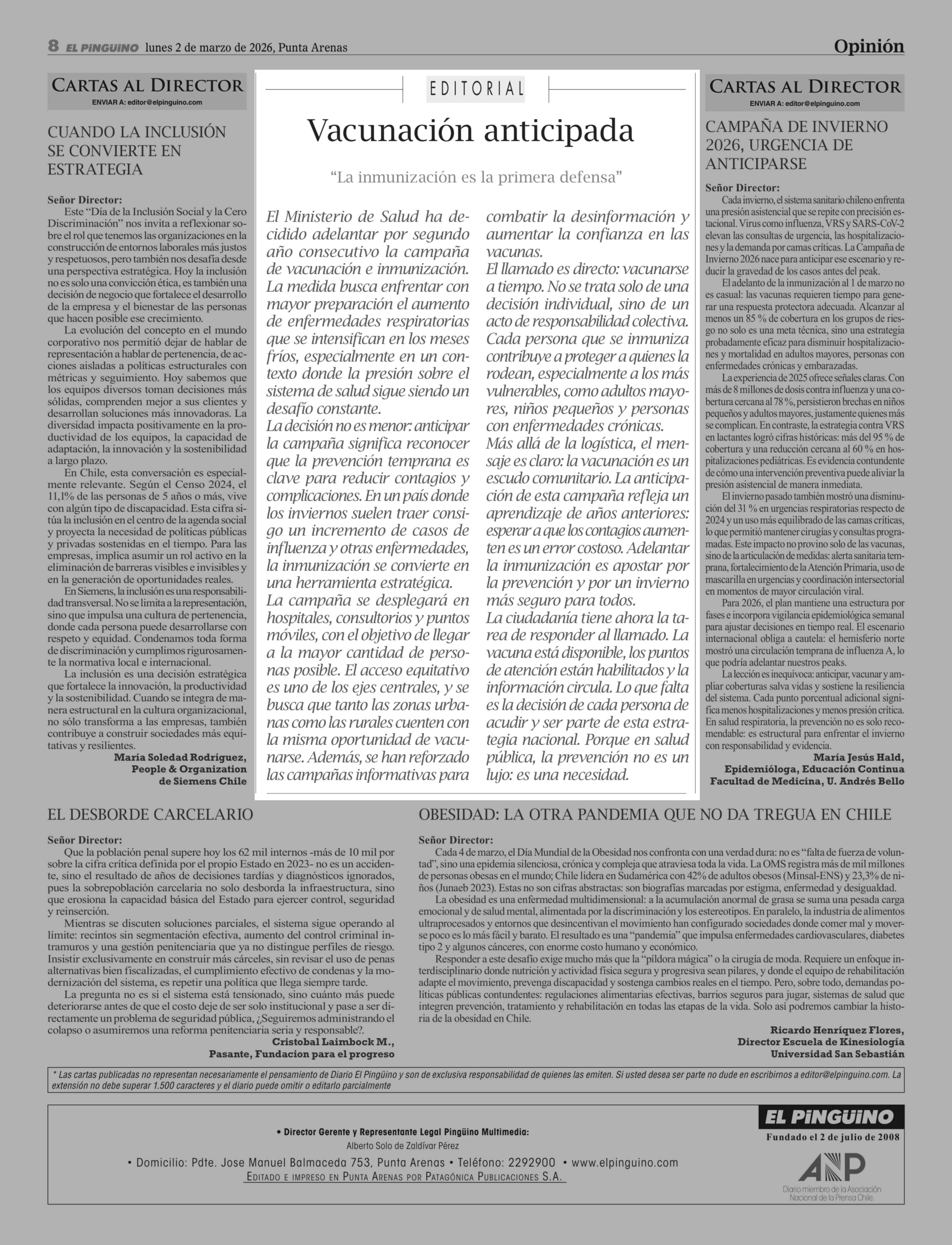 Editorial: Vacunación anticipada 02-03-2026 El Pingüino |