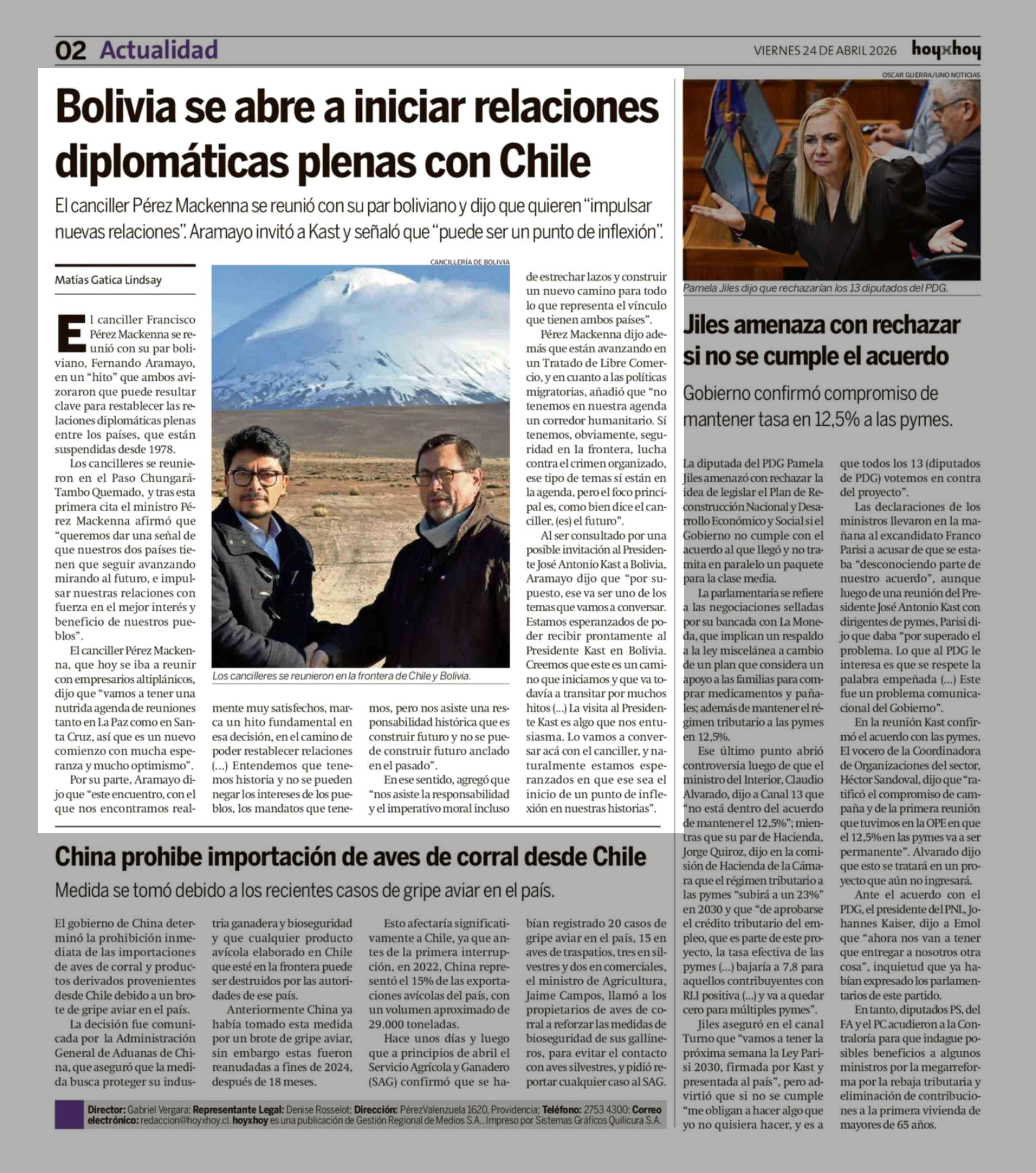 Bolivia se abre a iniciar relaciones diplomáticas plenas con Chile 24-04-2026 Hoy x Hoy |
