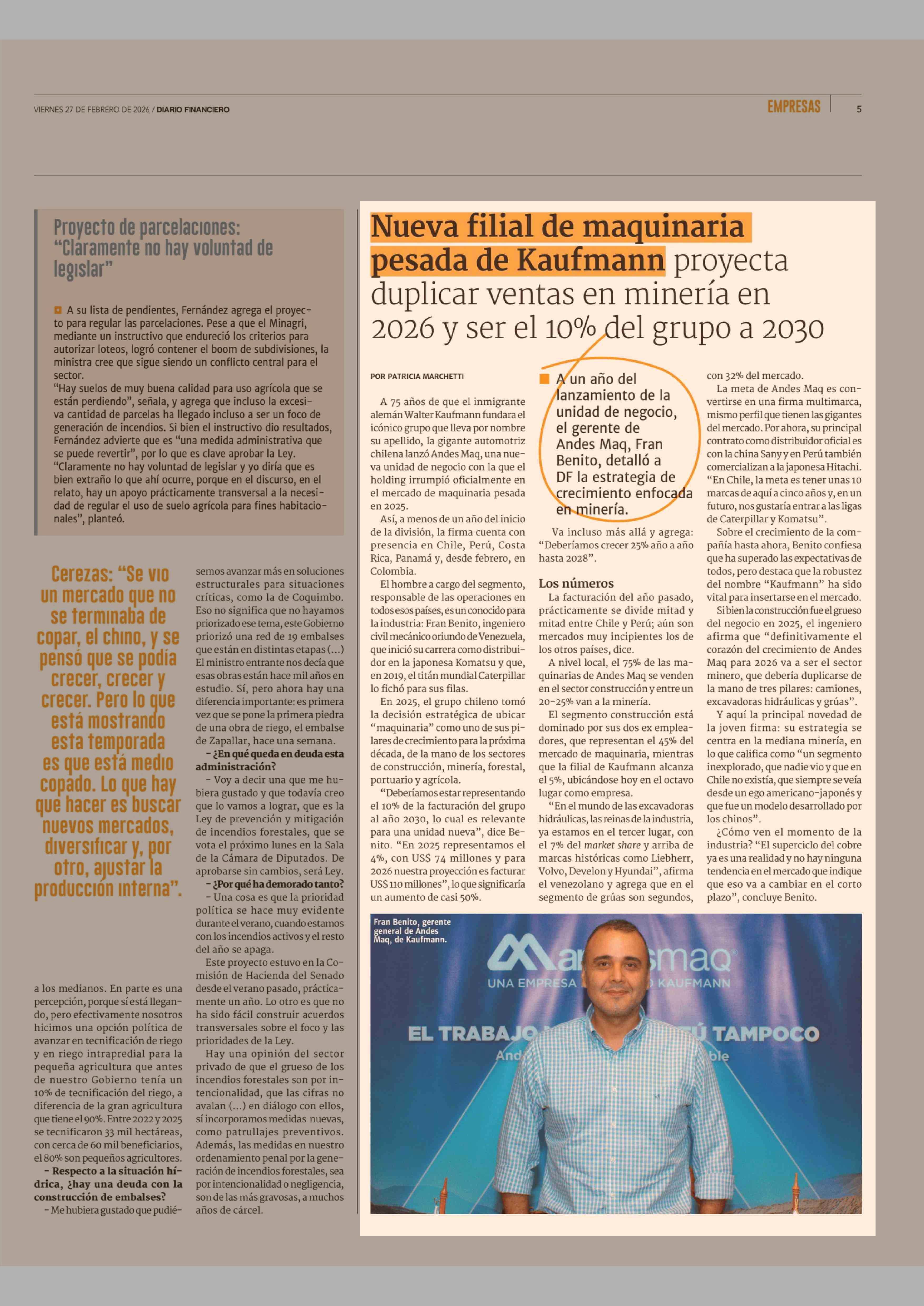 Título: Nueva filial de maquinaria pesada de Kaufmann proyecta duplicar ventas en minería en 2026 y ser el 10% del grupo a 2030