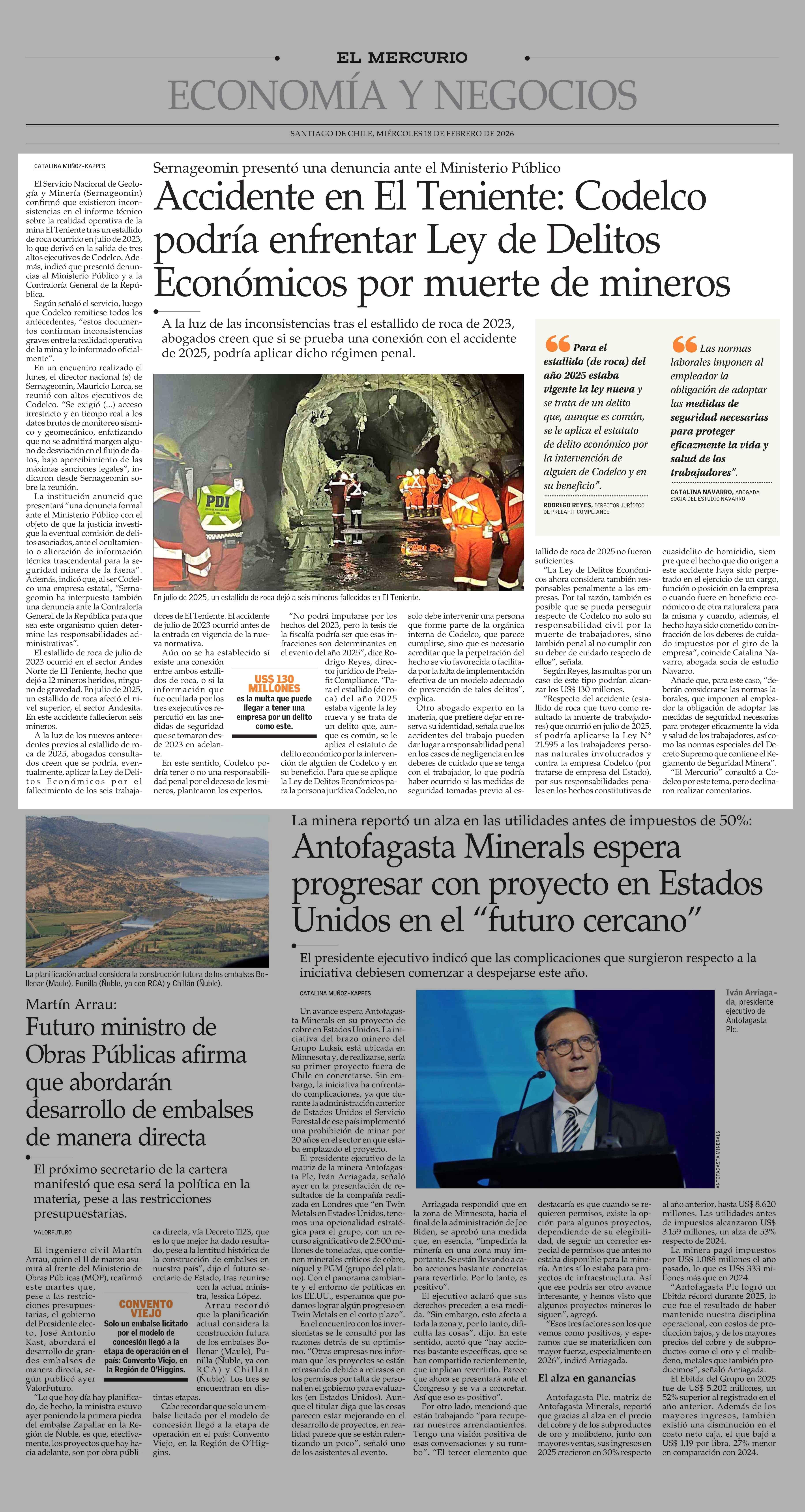 Accidente en El Teniente: Codelco podría enfrentar Ley de Delitos Económicos por muerte de mineros 18-02-2026 El Mercurio |