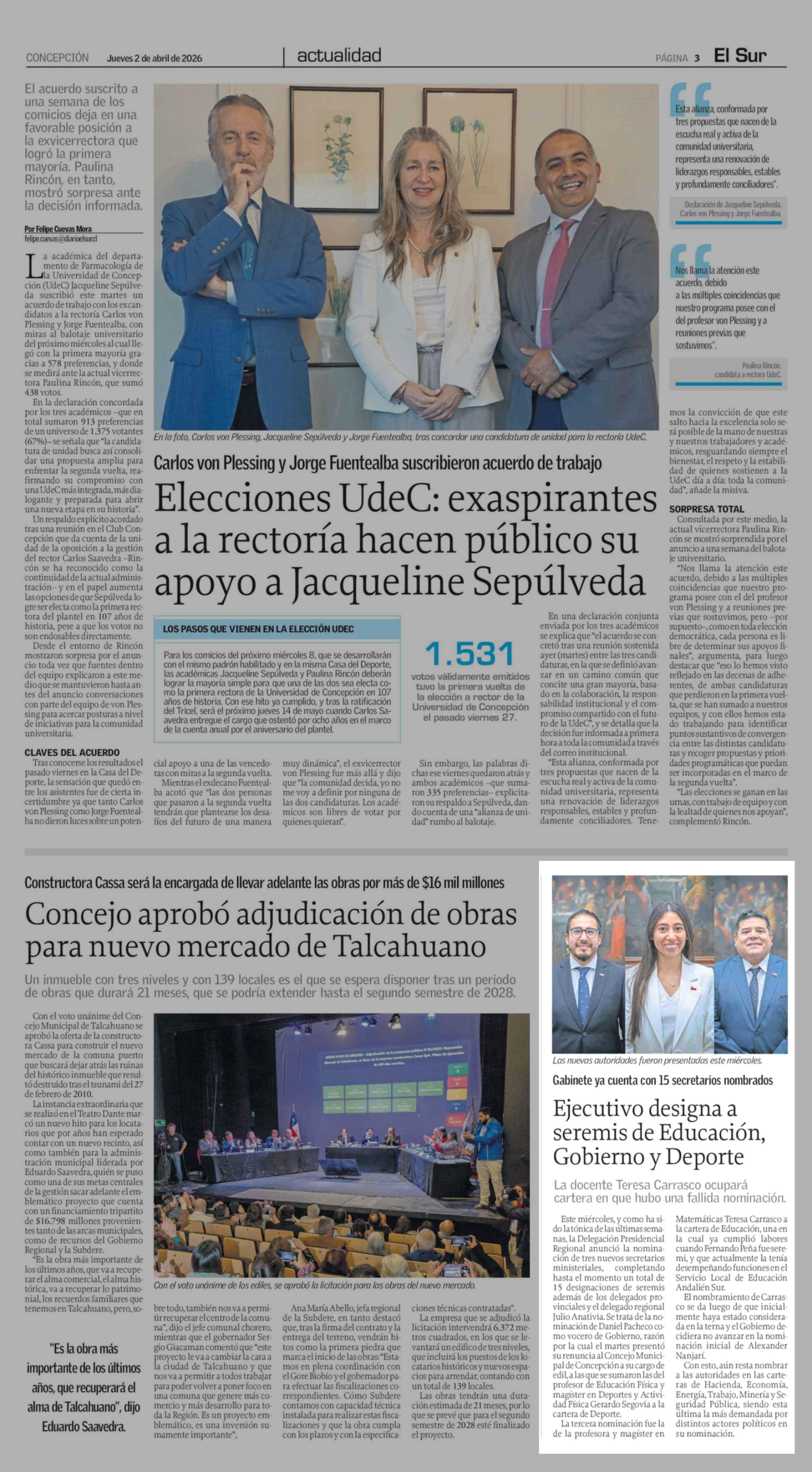 Ejecutivo designa a seremis de Educación, Gobierno y Deporte 02-04-2026 El Sur |