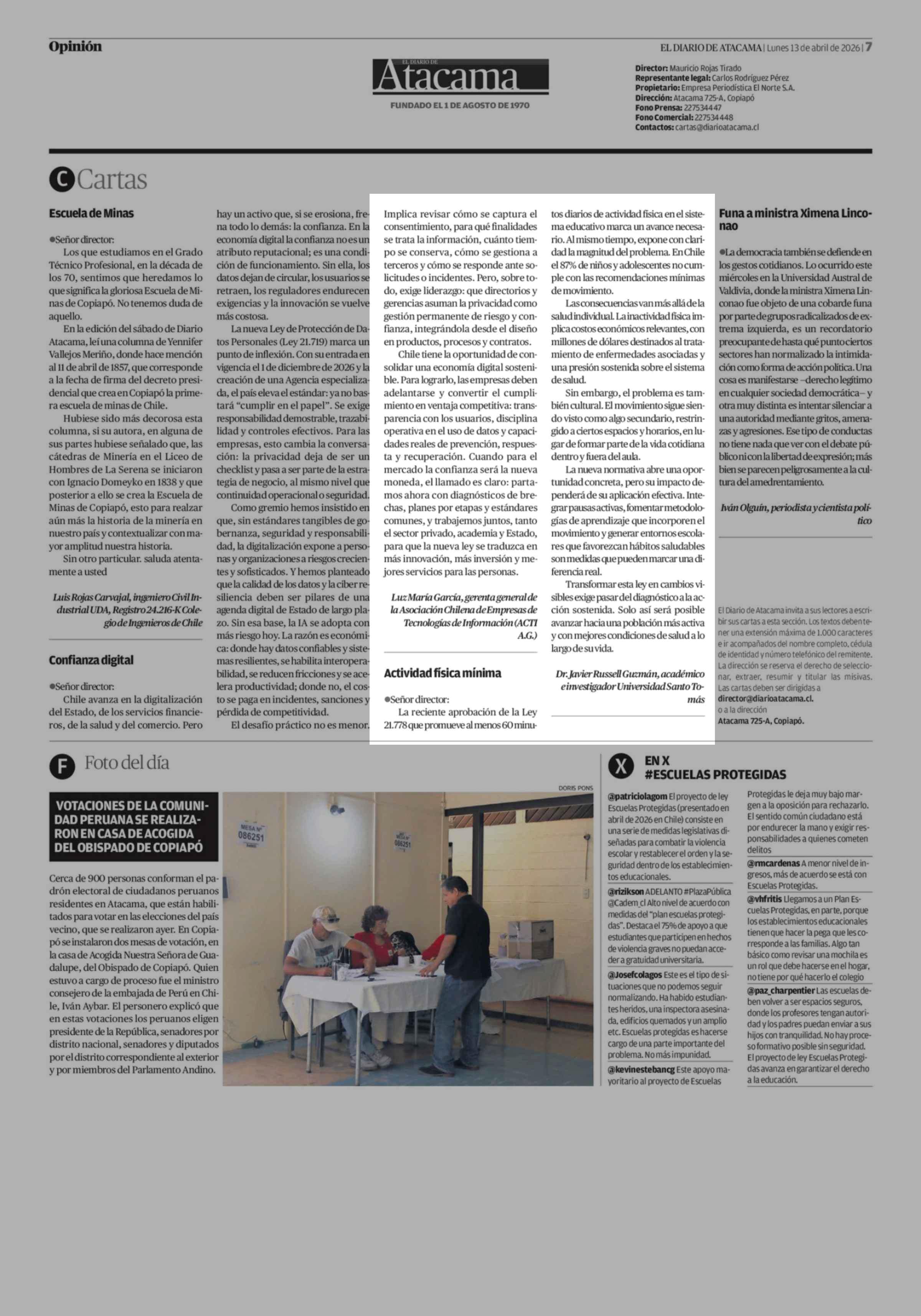Cartas: Actividad física mínima 13-04-2026 El Diario de Atacama |