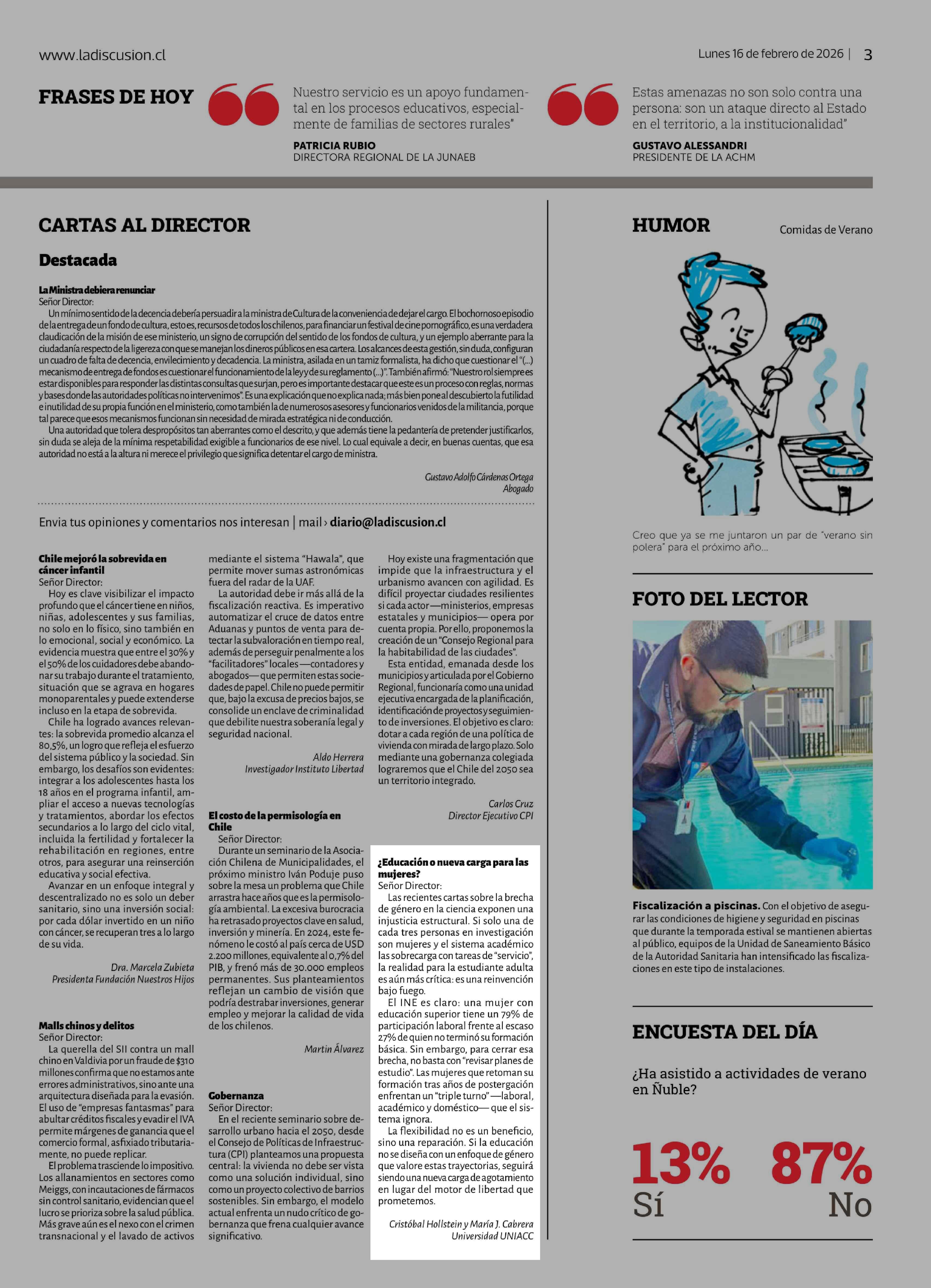 CARTAS: ¿Educación o nueva carga para las mujeres? 16-02-2026 La Discusión |